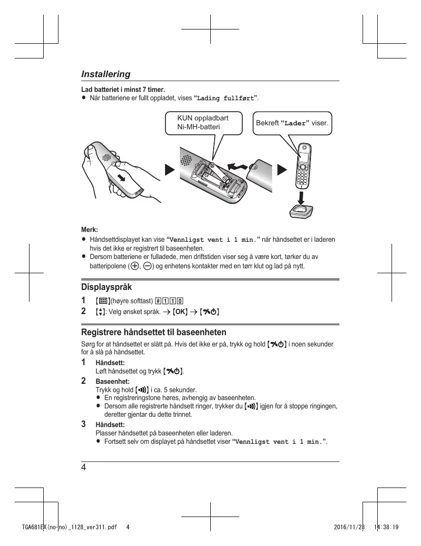 2016/11/28 14:38:19 Installering Lad batteriet i minst 7 timer. R Når batteriene er fullt oppladet, vises “Lading fullført”. KUN oppladbart Ni-MH-batteri Bekreft “Lader” viser. Merk: R Håndsettdisplayet kan vise “Vennligst vent i 1 min.” når håndsettet er i laderen hvis det ikke er registrert til baseenheten. R Dersom batteriene er fulladede, men driftstiden viser seg å være kort, tørker du av batteripolene ( , ) og enhetens kontakter med en tørr klut og lad på nytt. Displayspråk 1 M N(høyre softtast) #110 2 MbN: Velg ønsket språk. a MOKN a MeN Registrere håndsettet til baseenheten Sørg for at håndsettet er slått på. Hvis det ikke er på, trykk og hold MeN i noen sekunder for å slå på håndsettet. 1 Håndsett: Løft håndsettet og trykk MeN. 2 Baseenhet: Trykk og hold M N i ca. 5 sekunder. R En registreringstone høres, avhengig av baseenheten. R Dersom alle registrerte håndsett ringer, trykker du M N igjen for å stoppe ringingen, deretter gjentar du dette trinnet. 3 Håndsett: Plasser håndsettet på baseenheten eller laderen. R Fortsett selv om displayet på håndsettet viser “Vennligst vent i 1 min.”.