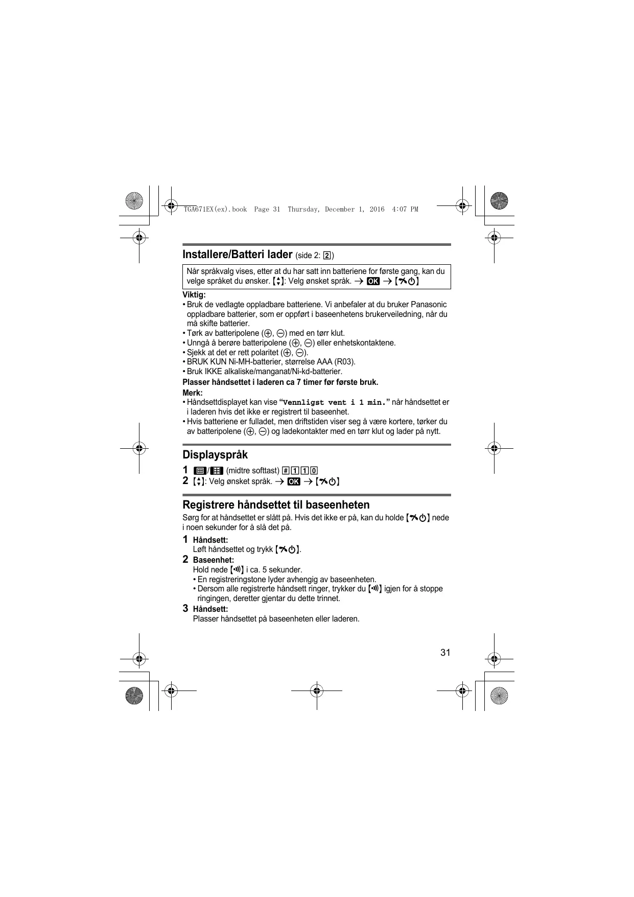 TGA671EX(ex).book Page 31 Thursday, December 1, 2016 4:07 PM Installere/Batteri lader (side 2: 2) Når språkvalg vises, etter at du har satt inn batteriene for første gang, kan du velge språket du ønsker. {r}: Velg ønsket språk. s M s {ic} Viktig: