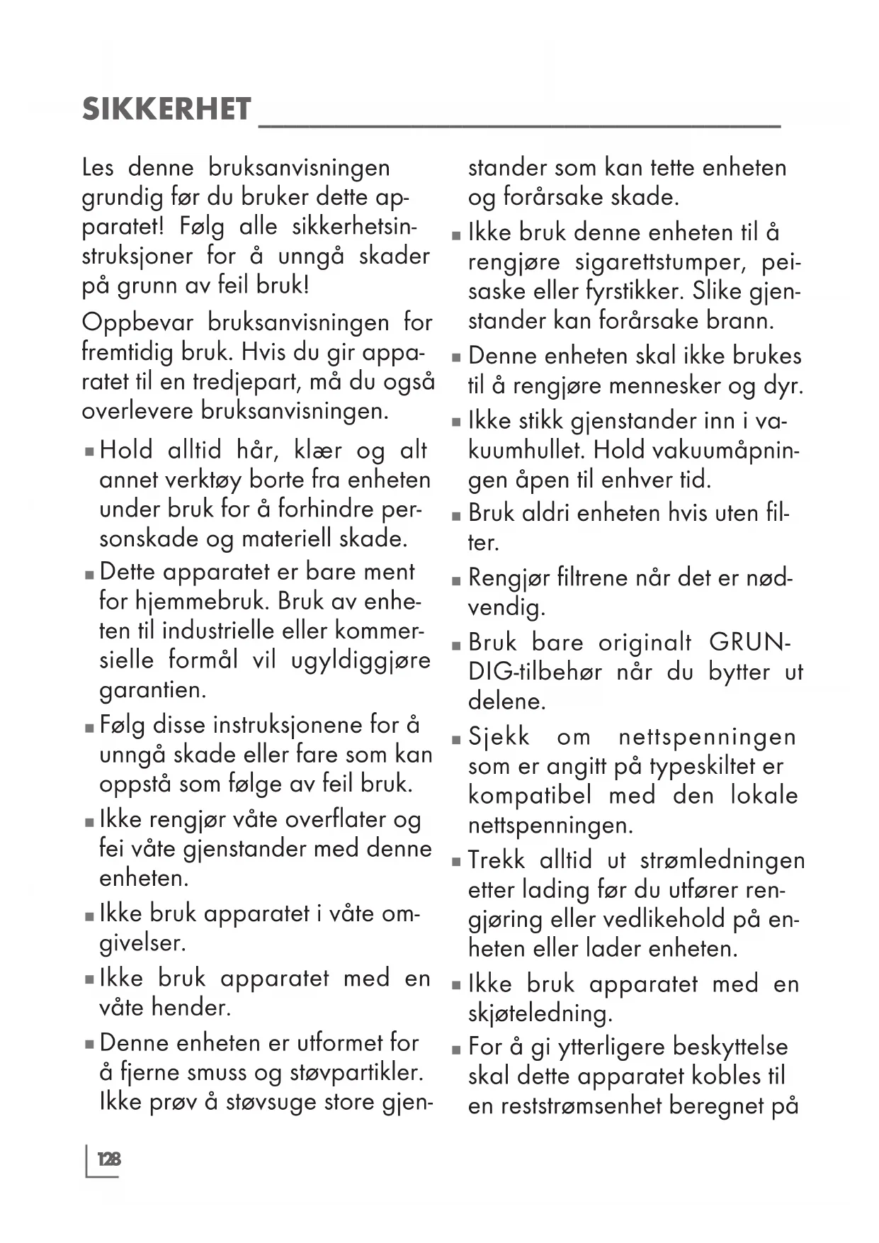 GRUNDIG-husholdningsappa- rater overholder gjeldende sik- kerhetsstandarder. Derfor, når apparatet eller strømledningen er skadet, må den byttes ut av sel- geren, servicesenteret eller en servicemyndighet med tilsvare ekspertise og myndighet for å unngå fare. Mangelfullt eller ik- ke-kvalifisert reparasjonsarbeid kan føre til fare og risiko for brukeren.