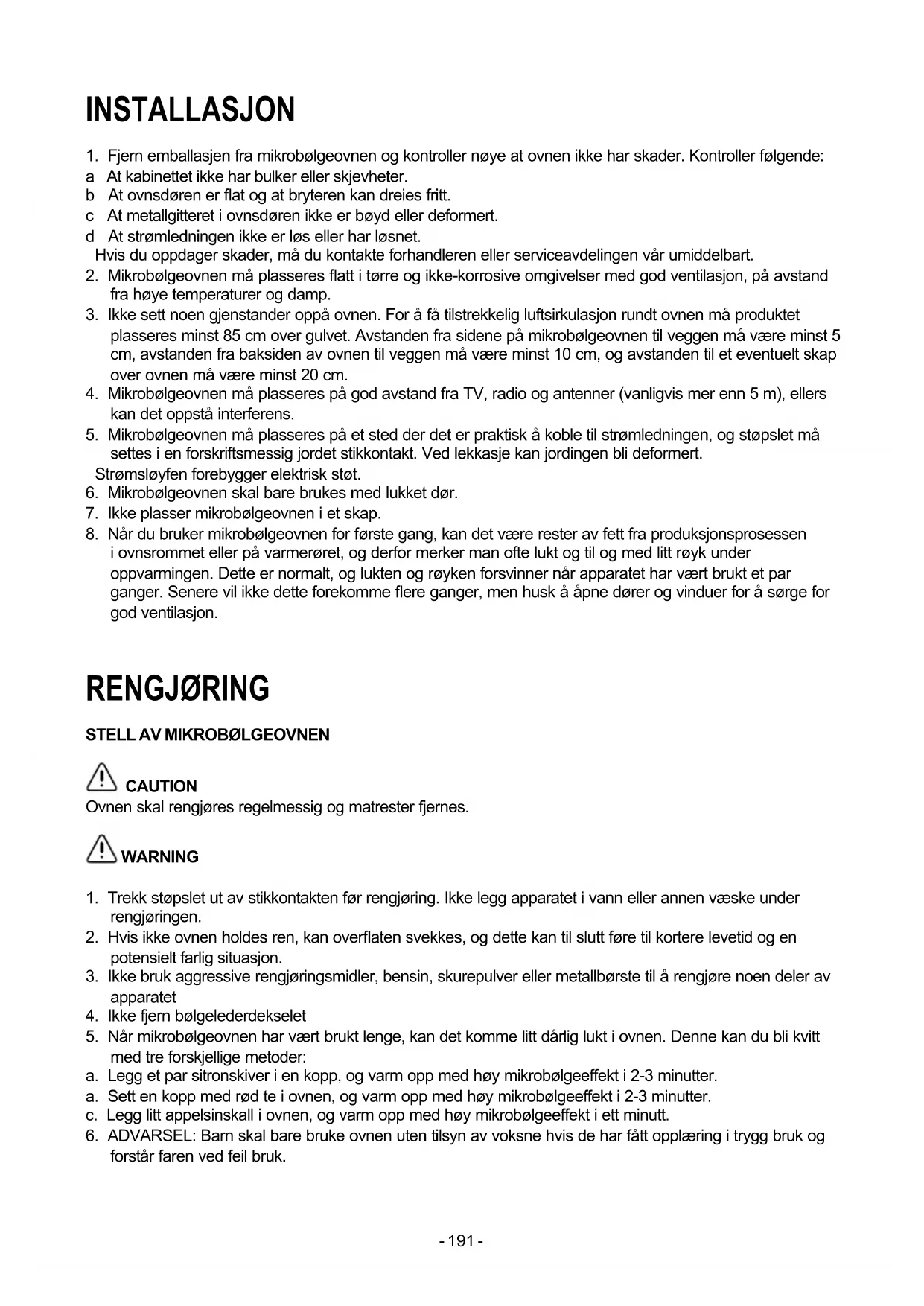CAUTION Ovnen skal rengjøres regelmessig og matrester fjernes. WARNING