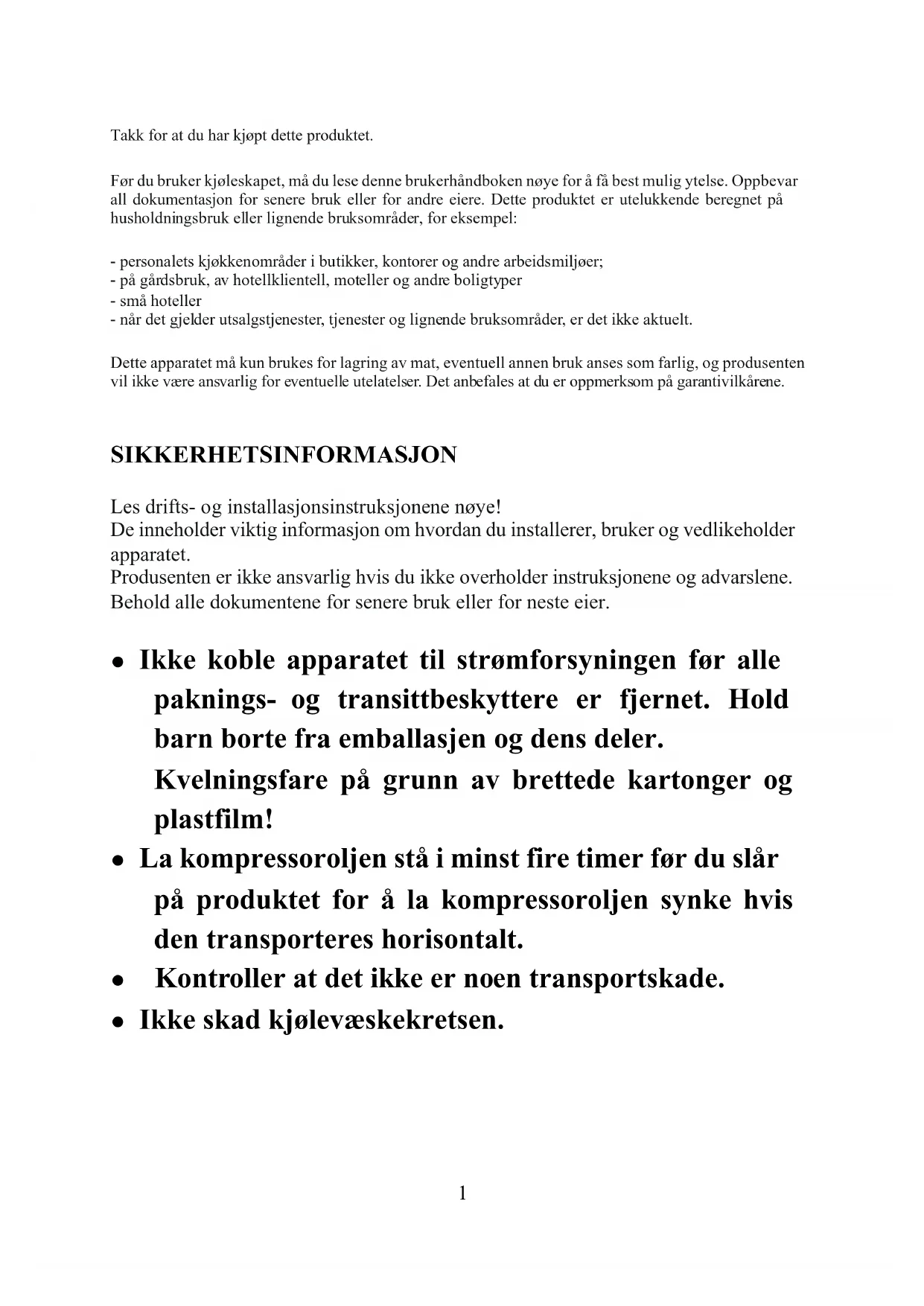 Takk for at du har kjøpt dette produktet. Før du bruker kjøleskapet, må du lese denne brukerhåndboken nøye for å få best mulig ytelse. Oppbevar all dokumentasjon for senere bruk eller for andre eiere. Dette produktet er utelukkende beregnet på husholdningsbruk eller lignende bruksområder, for eksempel: - personalets kjøkkenområder i butikker, kontorer og andre arbeidsmiljøer; - på gårdsbruk, av hotellklientell, moteller og andre boligtyper - små hoteller - når det gjelder utsalgstjenester, tjenester og lignende bruksområder, er det ikke aktuelt. Dette apparatet må kun brukes for lagring av mat, eventuell annen bruk anses som farlig, og produsenten vil ikke være ansvarlig for eventuelle utelatelser. Det anbefales at du er oppmerksom på garantivilkårene. SIKKERHETSINFORMASJON Les drifts- og installasjonsinstruksjonene nøye! De inneholder viktig informasjon om hvordan du installerer, bruker og vedlikeholder apparatet. Produsenten er ikke ansvarlig hvis du ikke overholder instruksjonene og advarslene. Behold alle dokumentene for senere bruk eller for neste eier. ● Ikke koble apparatet til strømforsyningen før alle paknings- og transittbeskyttere er fjernet. Hold barn borte fra emballasjen og dens deler. Kvelningsfare på grunn av brettede kartonger og plastfilm! ● La kompressoroljen stå i minst fire timer før du slår på produktet for å la kompressoroljen synke hvis den transporteres horisontalt. ● Kontroller at det ikke er noen transportskade. ● Ikke skad kjølevæskekretsen.