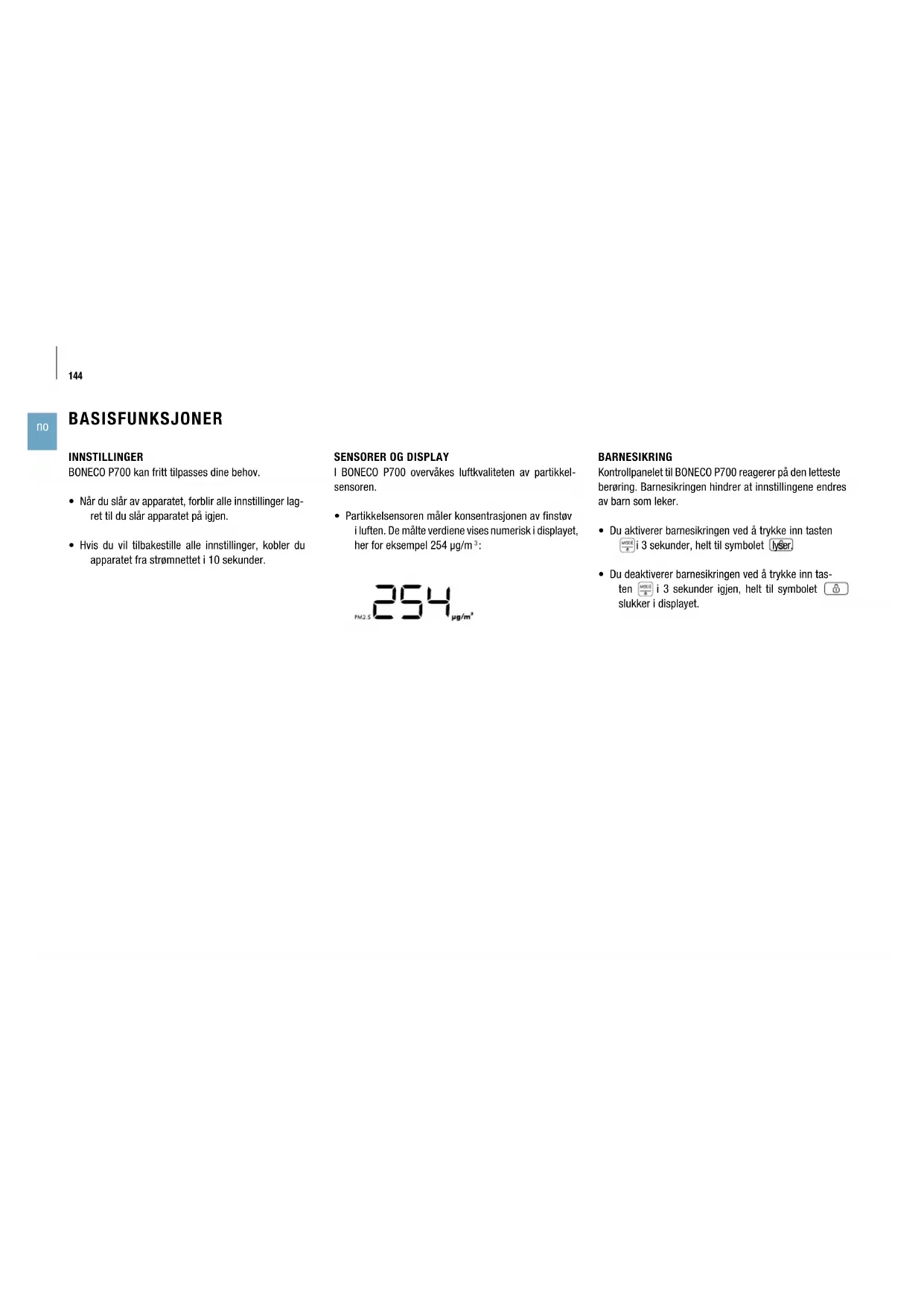 - Du deaktiverer barnesikringen ved å trykke inn tas- ten i 3 sekunder igjen, helt til symbolet slukker i displayet. BASISFUNKSJONER145