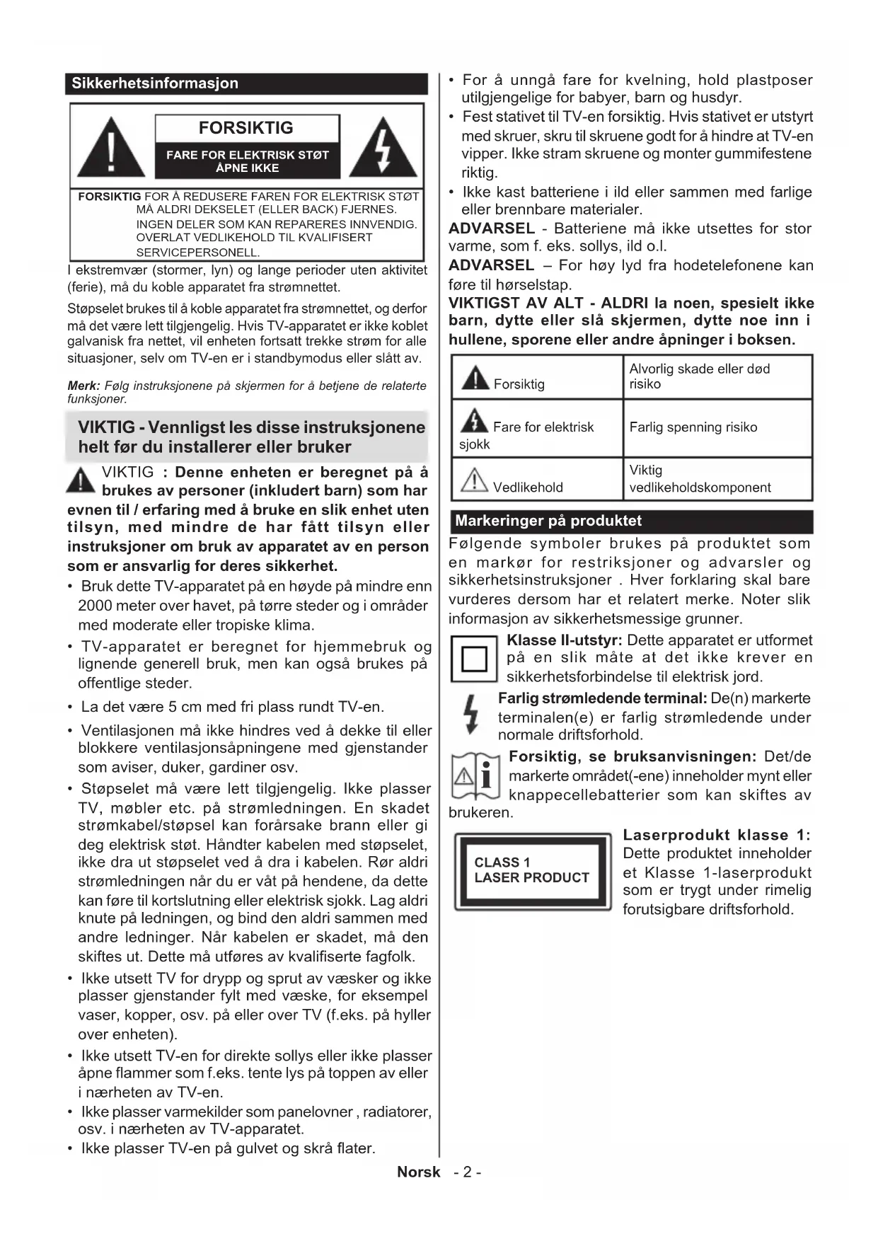 -ordmerke og -logoer er registrerte varemerker eid av Bluetooth SIG, Inc. og enhver bruk av slike merker av Vestel Elektronik Sanayi ve Ticaret A.S. er under lisens. Andre varemerker og varenavn tilhører sine respektive eiere. Dette produktet inneholder teknologi som er underlagt visse immaterielle rettigheter av Microsoft. Bruk eller distribusjon av denne teknologien utover dette produktet er forbudt uten riktig(e) lisens(er) fra Microsoft. Innholdseiere bruker Microsoft Playready™-teknologi for innholdstilgang for å beskytte sine immaterielle rettigheter, herunder opphavsrettslig beskyttet innhold. Denne enheten bruker Playready-teknologi for å få tilgang til Playready-beskyttet innhold og/ eller WMDRM-beskyttet innhold. Hvis enheten ikke håndhever begrensninger av innholdsbruk, kan innholdseiere be Microsoft om å oppheve enhetens evne til å bruke Playready-beskyttet innhold. Oppheving skal ikke påvirke ubeskyttet innhold eller innhold som er beskyttet av andre innholdstilgangsteknologier. Innholdseiere kan kreve at du oppgraderer Playready for å få tilgang til innholdet deres. Hvis du avslår en oppgradering, vil du ikke kunne få tilgang til innhold som krever oppgraderingen. “CI Plus”-logoen er et varemerke for CI Plus LLP. Dette produktet er beskyttet av visse immaterielle rettigheter til Microsoft Corporation. Bruk eller distribusjon av slik teknologi utover dette produktet er forbudt uten en lisens fra Microsoft eller et datterselskap godkjent av Microsoft. Avhendingsinformasjon [Kun EU] Disse symbolene indikerer at det elektriske og elektroniske utstyret, samt batteriet, ikke skal kastes som generelt husholdningsavfall ved slutten av sin levetid. Produktet skal isteden leveres til gjeldende oppsamlingspunkt for resirkulering av elektrisk og elektronisk utstyr, så vel som batterier, for passende behandling, gjenvinning og resirkulerig i henhold til dine nasjonale lover og Direktiv 2012/19/EU og 2013/56/EU Ved å kaste dette produktet på korrekt måte, bidrar du til å ta vare på naturressursene og hindre potensielle negative effekter på miljøet og menneskers helse som ellers kan forårsakes ved upassende avfallshåndtering av dette produktet. For mer informasjon om oppsamlingspunkt og resirkulering av dette produktet, kontakt ditt lokale bykontor, din husholdningsavfallstjeneste eller forretningen der du kjøpte produktet. Du kan bli bøtelagt for ukorrekt avfallshåndtering av produktet, i henhold til nasjonale lover. (Forretningsbrukere) Hvis du ønsker å avhende produktet, kan du kontakte leverandøren din og sjekke vilkårene og betingelsene for kjøpskontrakten. [Andre land utenfor Den europeiske union] Disse symbolene gjelder kun i EU. Kontakt din lokale myndighet for å lære om avhending og resirkulering. Produktet og emballasjen bør tas til ditt lokale innsamlingspunkt for resirkulering. Noen innsamlingspunkter godtar produkter gratis. Merk: Skiltet Pb under symbolet for batterier indikerer at dette batteriet inneholder bly.