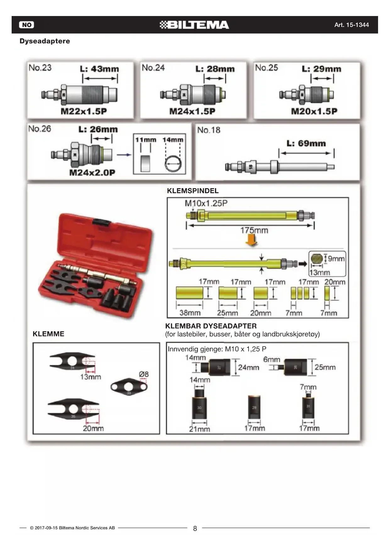 Dyseadaptere KLEMSPINDEL KLEMME KLEMBAR DYSEADAPTER (for lastebiler, busser, båter og landbrukskjøretøy) Innvendig gjenge: M10 x 1,25 PArt. 15-1344