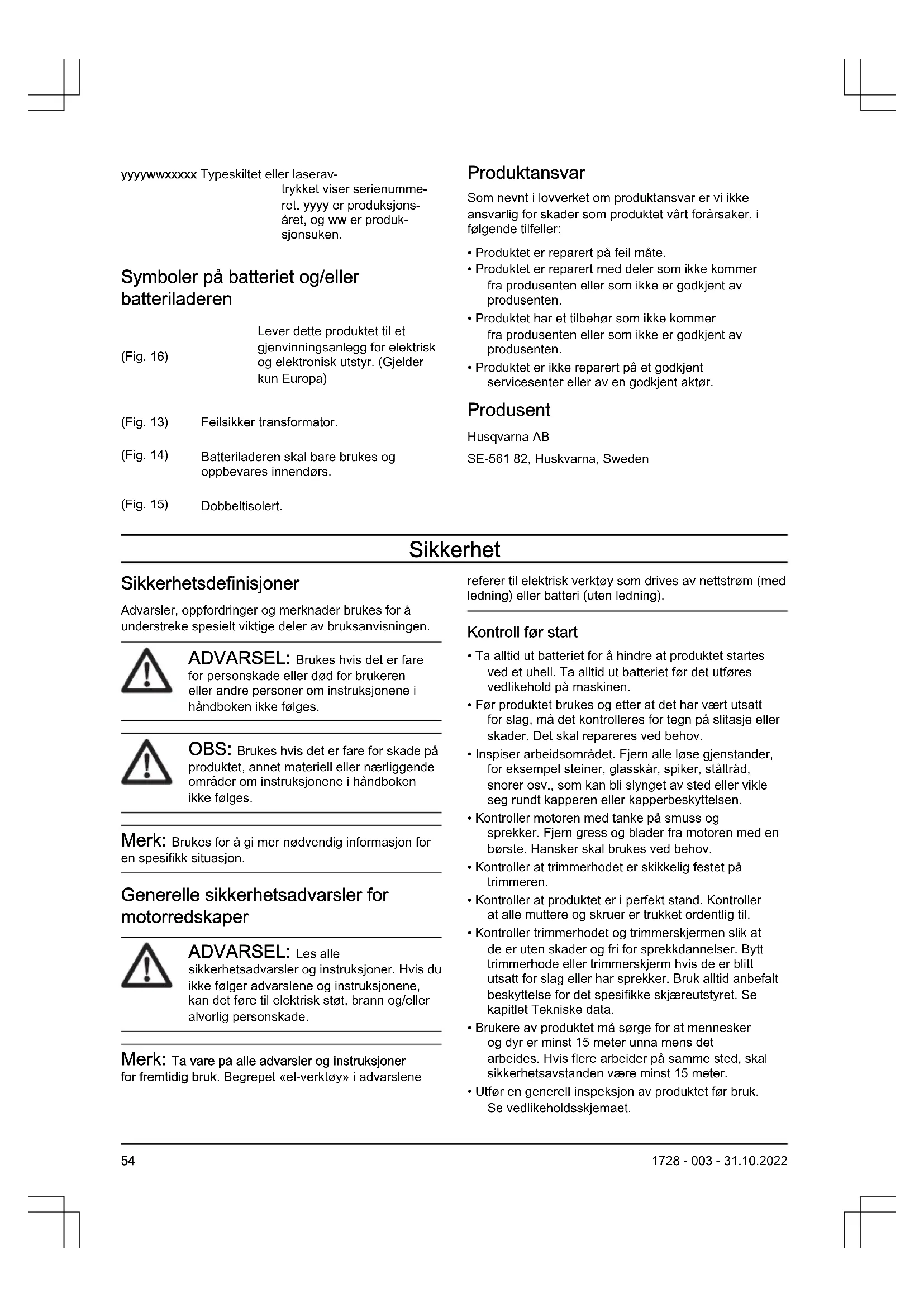 - Den opprinnelige konstruksjonen til produktet må ikke under noen omstendigheter endres uten tillatelse fra produsenten. Bruk alltid originalt tilbehør. Uautoriserte modifikasjoner og/eller tilleggsutstyr kan medføre alvorlige skader eller dødsfall for brukeren eller andre. Merk: Bruken kan være regulert av nasjonal eller lokal lovgivning. Følg gjeldende lovgivning. 56 1728 - 003 - 31.10.2022Sikkerhetsinstruksjoner for drift ADVARSEL: Les de følgende advarselinstruksjonene før du bruker produktet.