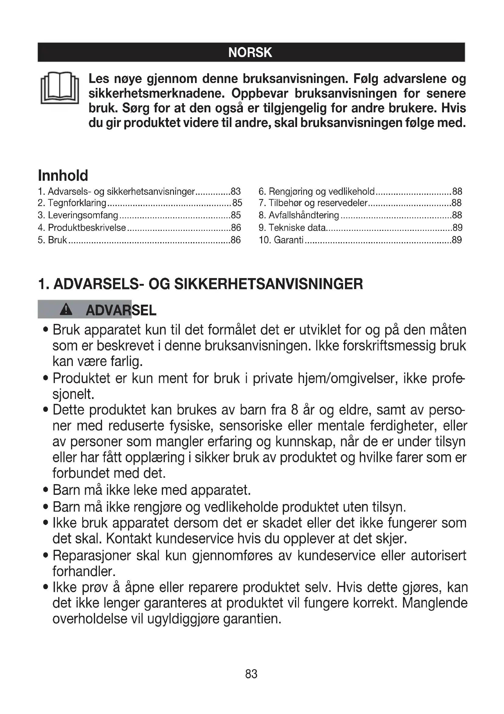 1. Advarsels- og sikkerhetsanvisninger ..............83