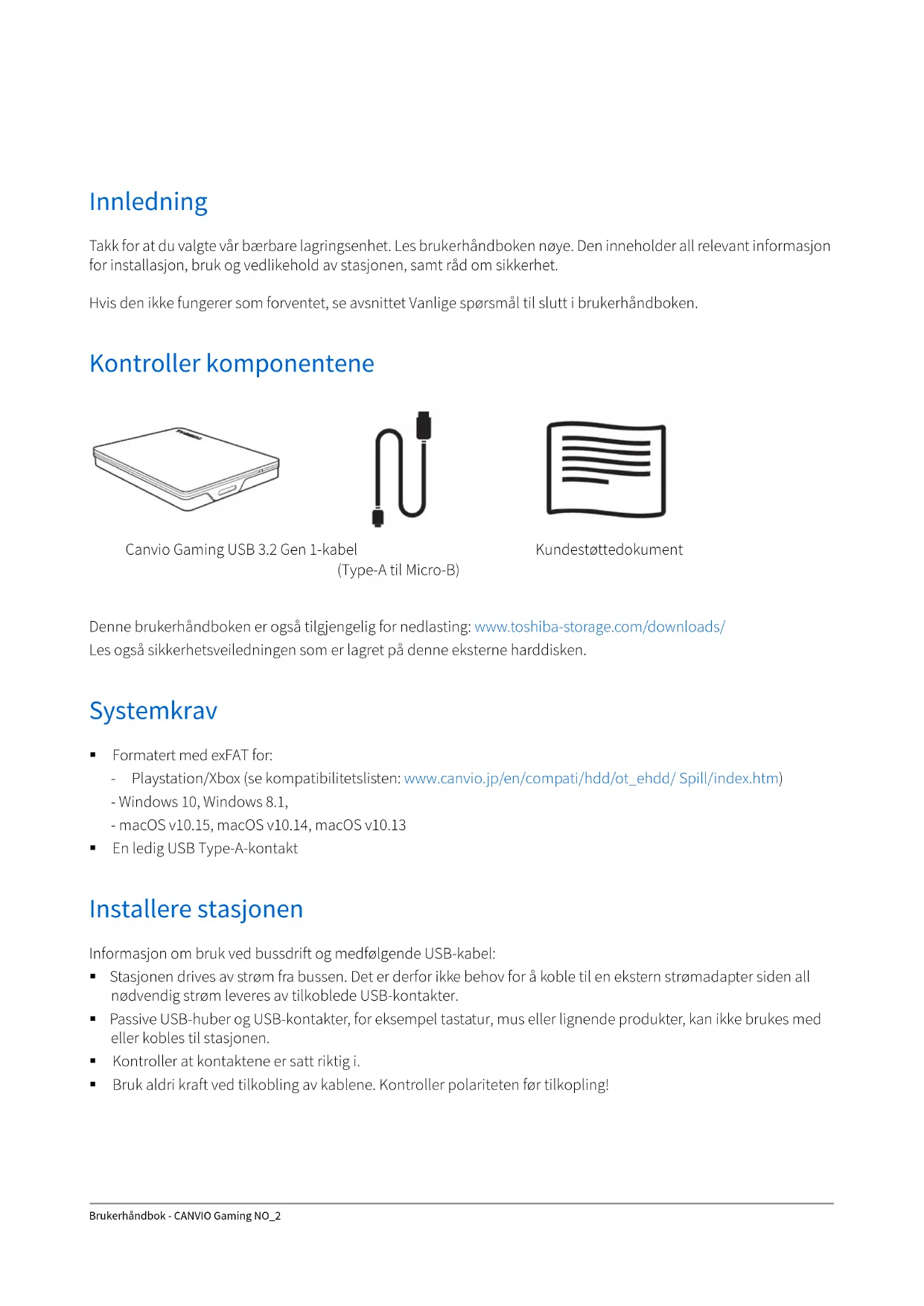 Når jeg prøver å formatere stasjonen, vises meldingen Could not complete format (Kan ikke fullføre formateringen). Sv: Dette kan skyldes at du formaterer stasjonen med et FAT-filsystem. Prøv et NTFS-filsystem. Dette bør løse problemet. TOSHIBA Kundestøtte Trenger du hjelp? Gå til Toshibas kundestøtteside for harddisker og lagringsenheter: www.toshiba-storage.com/support For garantikrav, se www.toshiba-storage.com/warranty-claims Når du formaterer stasjonen, blir alle dataene på den slettet. MERKBrukerhåndbok - CANVIO Gaming NO_6 Informasjon om regelverk CE-merking Arbeidsomgivelser Elektromagnetisk kompatibilitet (EMC) for dette produktet er kontrollert for denne produktkategorien i «husholdninger, kontorer og lettere industrimiljøer». Andre arbeidsmiljøer er ikke kontrollert av Toshiba, og bruk av dette utstyret i slike miljøer kan være forbudt eller kan ikke anbefales. Mulige konsekvenser av å bruke dette produktet i ikke-- kontrollerte driftsmiljøer kan blant annet være: interferens mellom andre produkter og dette produktet i nærheten med midlertidig funksjonsfeil eller tap av data som resultat. Eksempel på ikke-verifiserte driftsmiljøer og relaterte råd: Tyngre industrimiljøer (for eksempel miljøer med en trefasespenning på 380 V): Fare for interferens for dette produktet på grunn av kraftig elektromagnetisk felt, spesielt i nærheten av stort maskineri eller strømforsyningsenheter. Medisinske miljøer: Overholdelse av det medisinske produktdirektivet (Medical Product Directive) er ikke kontrollert av Toshiba, og dette produktet kan derfor ikke brukes som medisinsk produkt uten ytterligere kontroll. Bruk i vanlige kontormiljøer, for eksempel sykehus, skal ikke være et problem hvis det ikke er noen begrensninger fra ansvarlig ledelse. Bil i bevegelse: Se i eierveiledningen for det aktuelle kjøretøyet for råd angående bruk av dette produktet (kategori). Flymiljøer: Følg instruksjonene som flypersonalet gir, når det gjelder begrensninger for bruken. Ekstra miljøer som ikke er relatert til EMC Utendørsbruk: Som vanlig hjemme-/kontorutstyr har ikke dette produktet spesiell motstand mot fuktighetsinntrengning, og er ikke støtsikker. Eksplosiv atmosfære: Bruk av dette produktet i slike spesielle driftsmiljøer (Ex) er ikke tillatt. Følgende informasjon gjelder bare for EU-land: Samsvarserklæring for REACH Toshiba vil overholde alle REACH-krav (Registration, Evaluation, Authorization and Restriction of Chemicals), og vi er forpliktet til å gi kundene våre informasjon om kjemiske stoffer i produktene våre i henhold til REACH-regelverket. Kassering av produkter Følgende informasjon gjelder bare for Tyrkia: Overholder AEEE-direktivet. Dette produktet er CE-merket i henhold til kravene i gjeldende EU-direktiver. Ansvarlig for CE-merking er Toshiba Electronics Europe GmbH, Hansaallee 181, 40549 Düsseldorf, Tyskland. Symbolet angir at dette produktet ikke skal behandles som husholdningsavfall. Hvis du passer på at dette produktet kastes på riktig måte, hjelper du å forhindre mulige negative skadevirkninger på miljøet og helsen, som ellers kan forårsakes av feil avfallshåndtering av produktet. Hvis du vil ha nærmere informasjon om gjenvinning av dette produktet, tar du kontakt med det lokale kontoret, renovasjonsselskapet for husholdningsavfall eller butikken der du kjøpte produktet.Merknader ©2020 TOSHIBA Electronics Europe GmbH. Med enerett. Toshiba forbeholder seg retten til å gjøre tekniske endringer. Toshiba påtar seg ikke ansvar for skader som oppstår direkte eller indirekte på grunn av feil, utelatelser eller uoverensstemmelser mellom produktet og håndboken. Toshiba-navnet og Toshiba-logoene er registrerte varemerker for Toshiba. macOS er et varemerke for Apple Inc. Andre selskapsnavn, produktnavn og tjenestenavn kan være varemerker for sine respektive selskaper. Produktspesifikasjoner, konfigurasjoner, farger, komponenter og service kan endres uten varsel. En gigabyte (GB) betyr én milliard byte og en terabyte (TB) betyr én billion byte. Total tilgjengelig kapasitet vil variere basert på driftsmiljø, og resultatene og lagringskapasiteten vil variere tilsvarende. Operativsystemet på en datamaskin rapporterer imidlertid lagringskapasitet ved å bruke potenser av 2 for definisjonen av 1 TB = 2