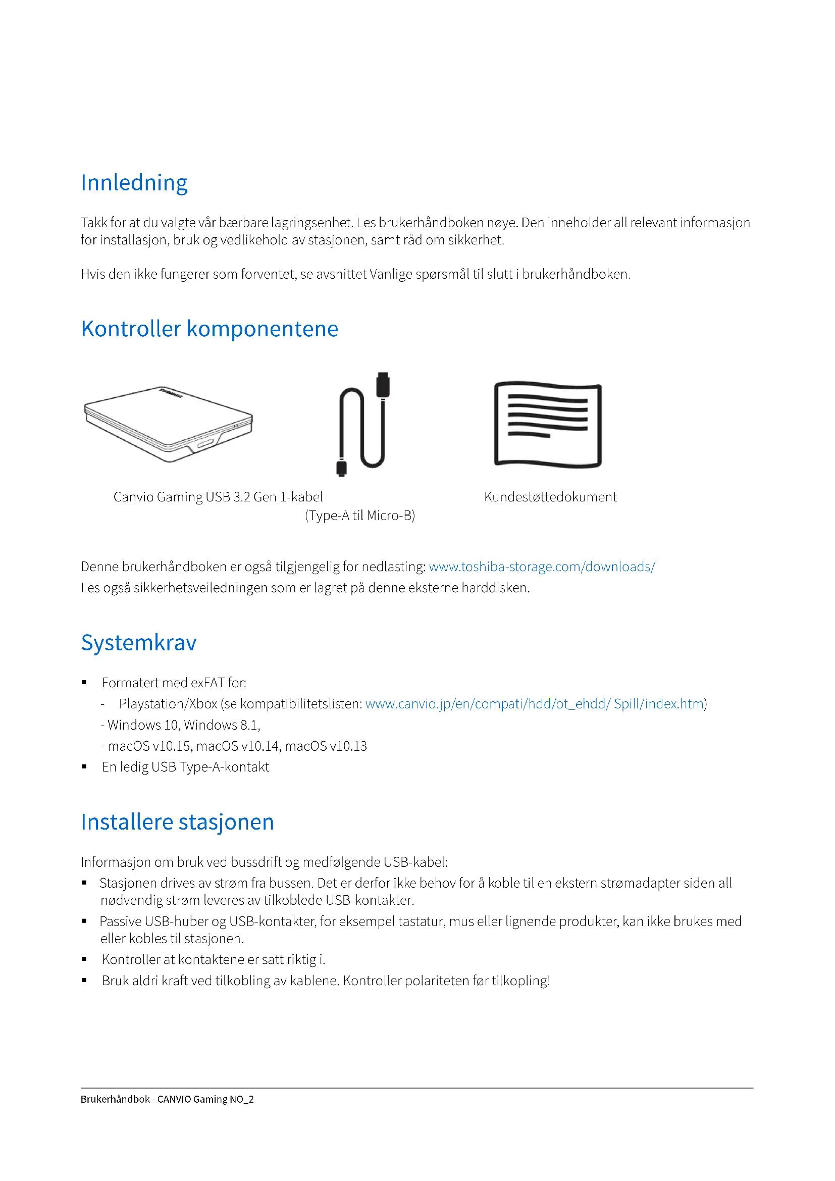 Når jeg prøver å formatere stasjonen, vises meldingen Could not complete format (Kan ikke fullføre formateringen). Sv: Dette kan skyldes at du formaterer stasjonen med et FAT-filsystem. Prøv et NTFS-filsystem. Dette bør løse problemet. TOSHIBA Kundestøtte Trenger du hjelp? Gå til Toshibas kundestøtteside for harddisker og lagringsenheter: www.toshiba-storage.com/support For garantikrav, se www.toshiba-storage.com/warranty-claims Når du formaterer stasjonen, blir alle dataene på den slettet. MERKBrukerhåndbok - CANVIO Gaming NO_6 Informasjon om regelverk CE-merking Arbeidsomgivelser Elektromagnetisk kompatibilitet (EMC) for dette produktet er kontrollert for denne produktkategorien i «husholdninger, kontorer og lettere industrimiljøer». Andre arbeidsmiljøer er ikke kontrollert av Toshiba, og bruk av dette utstyret i slike miljøer kan være forbudt eller kan ikke anbefales. Mulige konsekvenser av å bruke dette produktet i ikke-- kontrollerte driftsmiljøer kan blant annet være: interferens mellom andre produkter og dette produktet i nærheten med midlertidig funksjonsfeil eller tap av data som resultat. Eksempel på ikke-verifiserte driftsmiljøer og relaterte råd: Tyngre industrimiljøer (for eksempel miljøer med en trefasespenning på 380 V): Fare for interferens for dette produktet på grunn av kraftig elektromagnetisk felt, spesielt i nærheten av stort maskineri eller strømforsyningsenheter. Medisinske miljøer: Overholdelse av det medisinske produktdirektivet (Medical Product Directive) er ikke kontrollert av Toshiba, og dette produktet kan derfor ikke brukes som medisinsk produkt uten ytterligere kontroll. Bruk i vanlige kontormiljøer, for eksempel sykehus, skal ikke være et problem hvis det ikke er noen begrensninger fra ansvarlig ledelse. Bil i bevegelse: Se i eierveiledningen for det aktuelle kjøretøyet for råd angående bruk av dette produktet (kategori). Flymiljøer: Følg instruksjonene som flypersonalet gir, når det gjelder begrensninger for bruken. Ekstra miljøer som ikke er relatert til EMC Utendørsbruk: Som vanlig hjemme-/kontorutstyr har ikke dette produktet spesiell motstand mot fuktighetsinntrengning, og er ikke støtsikker. Eksplosiv atmosfære: Bruk av dette produktet i slike spesielle driftsmiljøer (Ex) er ikke tillatt. Følgende informasjon gjelder bare for EU-land: Samsvarserklæring for REACH Toshiba vil overholde alle REACH-krav (Registration, Evaluation, Authorization and Restriction of Chemicals), og vi er forpliktet til å gi kundene våre informasjon om kjemiske stoffer i produktene våre i henhold til REACH-regelverket. Kassering av produkter Følgende informasjon gjelder bare for Tyrkia: Overholder AEEE-direktivet. Dette produktet er CE-merket i henhold til kravene i gjeldende EU-direktiver. Ansvarlig for CE-merking er Toshiba Electronics Europe GmbH, Hansaallee 181, 40549 Düsseldorf, Tyskland. Symbolet angir at dette produktet ikke skal behandles som husholdningsavfall. Hvis du passer på at dette produktet kastes på riktig måte, hjelper du å forhindre mulige negative skadevirkninger på miljøet og helsen, som ellers kan forårsakes av feil avfallshåndtering av produktet. Hvis du vil ha nærmere informasjon om gjenvinning av dette produktet, tar du kontakt med det lokale kontoret, renovasjonsselskapet for husholdningsavfall eller butikken der du kjøpte produktet.Merknader ©2020 TOSHIBA Electronics Europe GmbH. Med enerett. Toshiba forbeholder seg retten til å gjøre tekniske endringer. Toshiba påtar seg ikke ansvar for skader som oppstår direkte eller indirekte på grunn av feil, utelatelser eller uoverensstemmelser mellom produktet og håndboken. Toshiba-navnet og Toshiba-logoene er registrerte varemerker for Toshiba. macOS er et varemerke for Apple Inc. Andre selskapsnavn, produktnavn og tjenestenavn kan være varemerker for sine respektive selskaper. Produktspesifikasjoner, konfigurasjoner, farger, komponenter og service kan endres uten varsel. En gigabyte (GB) betyr én milliard byte og en terabyte (TB) betyr én billion byte. Total tilgjengelig kapasitet vil variere basert på driftsmiljø, og resultatene og lagringskapasiteten vil variere tilsvarende. Operativsystemet på en datamaskin rapporterer imidlertid lagringskapasitet ved å bruke potenser av 2 for definisjonen av 1 TB = 2