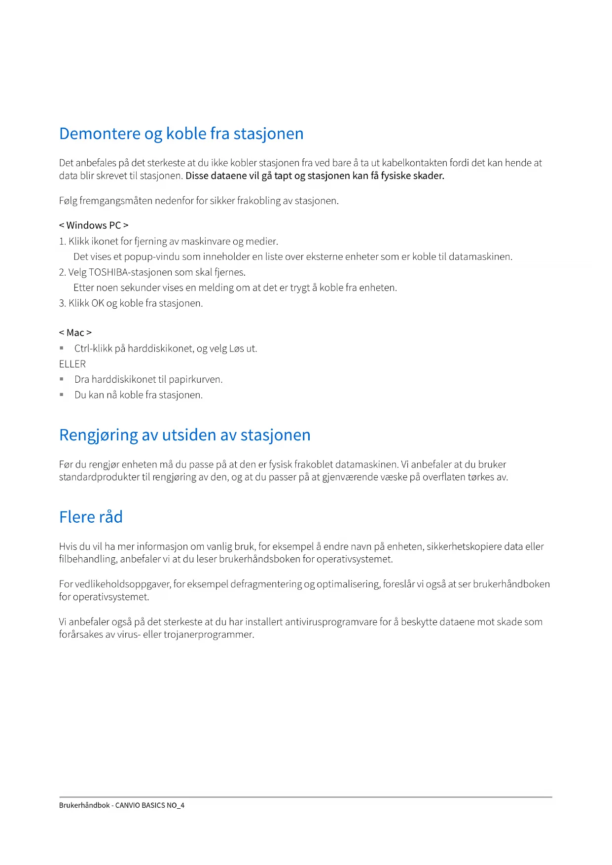 < Mac > Ctrl-klikk på harddiskikonet, og velg Løs ut. ELLER Dra harddiskikonet til papirkurven. Du kan nå koble fra stasjonen. Rengjøring av utsiden av stasjonen Før du rengjør enheten må du passe på at den er fysisk frakoblet datamaskinen. Vi anbefaler at du bruker standardprodukter til rengjøring av den, og at du passer på at gjenværende væske på overflaten tørkes av. Flere råd Hvis du vil ha mer informasjon om vanlig bruk, for eksempel å endre navn på enheten, sikkerhetskopiere data eller filbehandling, anbefaler vi at du leser brukerhåndsboken for operativsystemet. For vedlikeholdsoppgaver, for eksempel defragmentering og optimalisering, foreslår vi også at ser brukerhåndboken for operativsystemet. Vi anbefaler også på det sterkeste at du har installert antivirusprogramvare for å beskytte dataene mot skade som forårsakes av virus- eller trojanerprogrammer.Brukerhåndbok - CANVIO BASICS NO_5 Vanlige spørsmål Sp.: Må jeg ha USB-drivere for Windows? Sv.: Nei. De er allerede tilgjengelige i operativsystemet. Sp.: Kan jeg starte opp systemet fra stasjonen? Sv.: Nei. Windows støtter ikke oppstart fra eksterne harddisker. Sp.: Hvorfor trenger ikke stasjonen en vifte? Sv.: Stasjonene er utformet med maksimal varmeavledning, og derfor trengs det ingen vifte. Dette fører til at den er nesten lydløs når den brukes. Sp.: Hvorfor er stasjonskapasiteten (som vises i Windows) lavere enn den faktiske stasjonskapasiteten? Sv.: Forskjellen skyldes forskjellige metoder for beregning av kapasiteten. Harddiskprodusenter bruker desimalsystemet, og operativsystemet bruker binærsystemet. Eksempel med desimalsystemet: 1 TB = 1 000 GB 1 GB = 1 000 MB = 1 000 000 kB = 1 000 000 000 byte Eksempel med binærsystemet: 1 GB = 1 024 MB = 1 048 576 kB = 1 073 741 824 byte Dette fører til at en 1 TB (desimal) harddisk vises i Windows som om den har 931 GB (binært). Sp.: Kan jeg bruke stasjonen til å kopiere et operativsystem fra én datamaskin til en annen? Sv.: Nei. Du må følge installasjonsinstruksjonene fra leverandøren av operativsystemet. Det fungerer ikke å bare kopiere filene. Feilsøking Datamaskinen gjenkjenner ikke stasjonen. Kontroller at kablene er godt festet. Hvis stasjonen er koblet til via en USB-hub, kontrollerer du at den har en egen strømforsyning. Hvis du bruker et utvidelseskort, passer du på at det fungerer som det skal og oppdaterer programvaren/fastvare. Er det farlig hvis stasjonen føles varm når den brukes? Sv.: Dette er vanlig og ikke farlig. Feilmeldingen Device cannot start (Kan ikke starte enheten) vises. Sv.: Det er to mulige årsaker. Det er et strømproblem, og du må kontrollere tilkoblingene, eller stasjonen er skadet og må repareres.Brukerhåndbok - CANVIO BASICS NO_6 Stasjonen vises ikke i Min datamaskin, men den vises i Enhetsbehandling. Sv.: Følg disse instruksjonene: