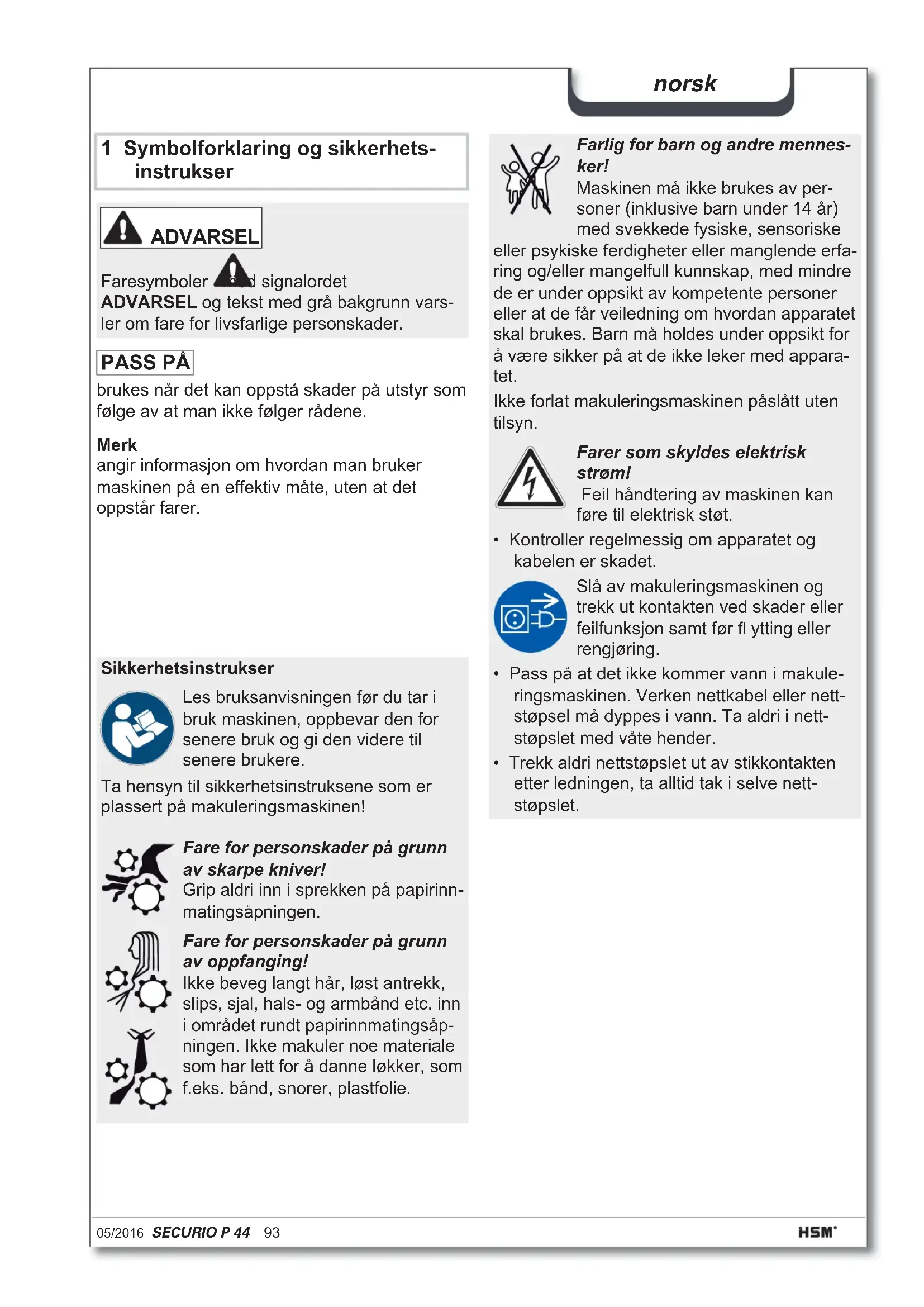 - Trekk aldri nettstøpslet ut av stikkontakten etter ledningen, ta alltid tak i selve nett- støpslet. PASS PÅ brukes når det kan oppstå skader på utstyr som følge av at man ikke følger rådene.94 SECURIO P 44 05/2016 norsk 3 Oversikt2 Tiltenkt bruk, garanti Det robuste skjæreapparatet er ufølsomt over- for stifter og binderser. Kun ved maskiner med skjærebredde 1x5 mm skal papiret ikke ha noen stifter eller binderser. Garantitiden for makuleringsmaskinen er på 3 år. Det gis en egen garanti som er uavhengig av garantiytelsen for HSM helstål skjæreaksler i makuleringsmaskinen i løpet av hele appara- tets levetid (HSM Lifetime Warranty). Unntatt fra dette er makuleringsmaskiner med en skjæ- rebredde på 0,78x11 mm og 1x5 mm. Slitasje, skader på grunn av utilsiktet bruk samt inngrep fra tredje part omfattes ikke av garantien. HMS garanterer levering av reservedeler i 10 år etter at produksjonen av denne modellen opphører. Se merkeskiltet på apparatets bakside for hvil- ken kuttebredde og nettspenning makulerings- maskinen er beregnet for, og les de aktuelle punktene i bruksanvisningen. Makuleringsmaskinen er utelukkende beregnet på makulering av papir. Avhengig av skjæ- remåte kan også små mengder av følgende materialer makuleres: Merk I det separate CD-skjæreapparatet (alternativ) kan du makulere CD-er, disketter og kredittkort, uavhengig av papirkutteverket. Merk: Din maskin har kanskje ikke alle kompo- nenter, dette avhenger av modellen. 1 Innmatingsspor for CD-er, disketter og kreditt- kort (tillegg) 2 Sikkerhetsinstrukser 3 Lysport i papirinnføringen 4 Sikkerhetselement 5 Betjenings- og indikeringsenhet 6 Holder for bruksanvisning og oljefl aske 7 Beholder for makuleringsmasse CD-er / disket- ter / kredittkort (tillegg) 8 Påfyllingsåpning skjæreblokkolje (kun partik- kelskjæring) 9 PAPERcontrol Skjærebredde (mm) 5,8 3,9 3,9x40 1,9x15Kredittkort, CD-er, disketter, USB-pinner●● ● ●