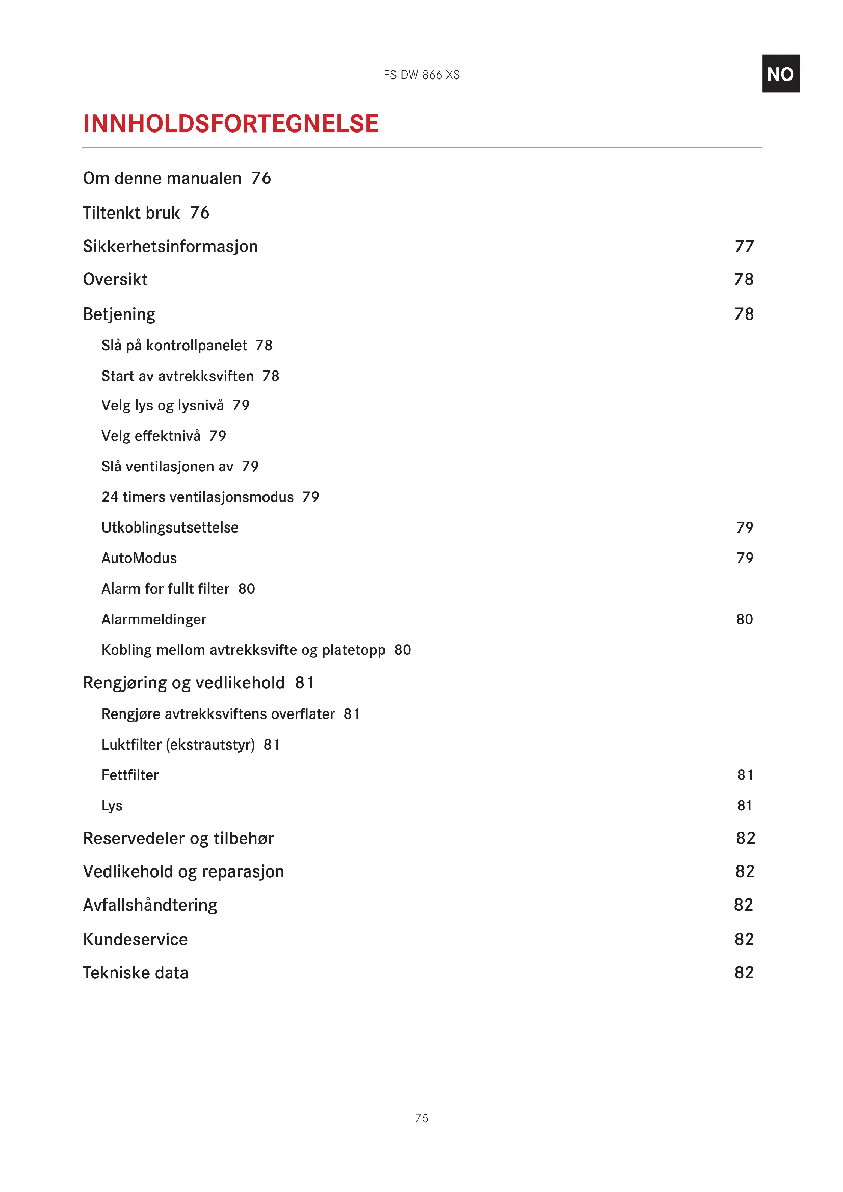 INNHOLDSFORTEGNELSE Om denne manualen 76 Tiltenkt bruk 76 Sikkerhetsinformasjon 77 Oversikt 78 Betjening 78 Slå på kontrollpanelet 78 Start av avtrekksviften 78 Velg lys og lysnivå 79 Velg effektnivå 79 Slå ventilasjonen av 79 24 timers ventilasjonsmodus 79 Utkoblingsutsettelse 79 AutoModus 79 Alarm for fullt filter 80 Alarmmeldinger 80 Kobling mellom avtrekksvifte og platetopp 80 Rengjøring og vedlikehold 81 Rengjøre avtrekksviftens overflater 81 Luktfilter (ekstrautstyr) 81 Fettfilter 81 Lys 81 Reservedeler og tilbehør 82 Vedlikehold og reparasjon 82 Avfallshåndtering 82 Kundeservice 82 Tekniske data 82FS DW 866 XS – 76 –