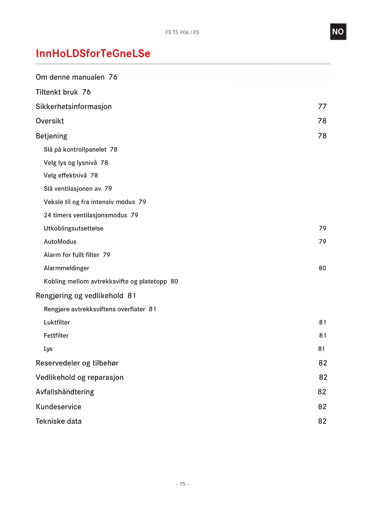 innholdsforTegnelse Om denne manualen 76 Tiltenkt bruk 76 Sikkerhetsinformasjon 77 Oversikt 78 Betjening 78 Slå på kontrollpanelet 78 Velg lys og lysnivå 78 Velg effektnivå 78 Slå ventilasjonen av 79 Veksle til og fra intensiv modus 79 24 timers ventilasjonsmodus 79 Utkoblingsutsettelse 79 AutoModus 79 Alarm for fullt filter 79 Alarmmeldinger 80 Kobling mellom avtrekksvifte og platetopp 80 Rengjøring og vedlikehold 81 Rengjøre avtrekksviftens overflater 81 Luktfilter 81 Fettfilter 81 Lys 81 Reservedeler og tilbehør 82 Vedlikehold og reparasjon 82 Avfallshåndtering 82 Kundeservice 82 Tekniske data 82FS TS 906 I XS – 76 –