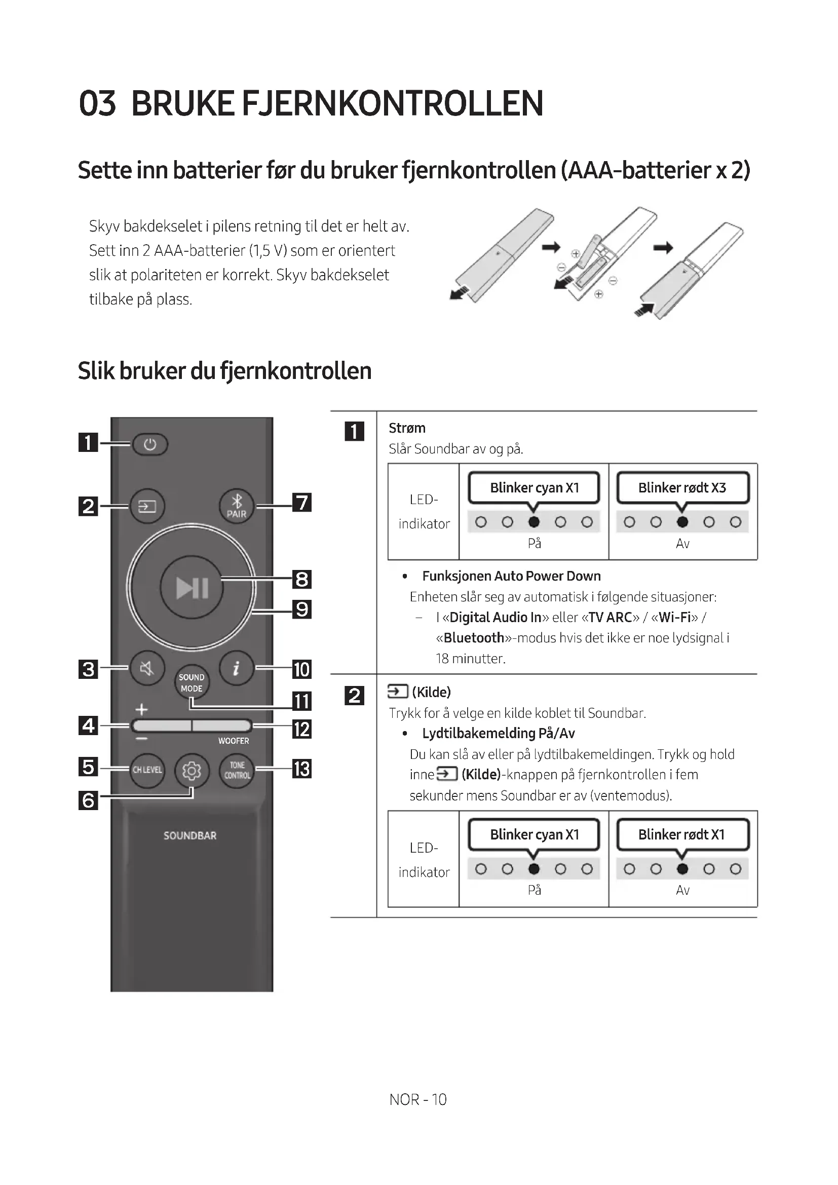 inneholder kjemikalier som er miljøskadelige. Ikke kast batteriene i restavfallet. Ikke kast batteriene i åpen ild. Ikke kortslutt, demonter eller overoppheter batteriene. FORSIKTIG : Det er fare for eksplosjon hvis batteriet ikke byttes ut riktig. Bytt det bare ut med samme eller tilsvarende type.NOR - 4 INNHOLD 01 Kontrollere komponentene 6 02 Produktoversikt 7 Frontpanel/toppanel på Soundbar ------------------------- 7 Bunnpanel på Soundbar ------------------------- 9 03 Bruke fjernkontrollen 10 Sette inn batterier før du bruker fjernkontrollen (AAA-batterier x 2) ------------------------- 10 Slik bruker du fjernkontrollen