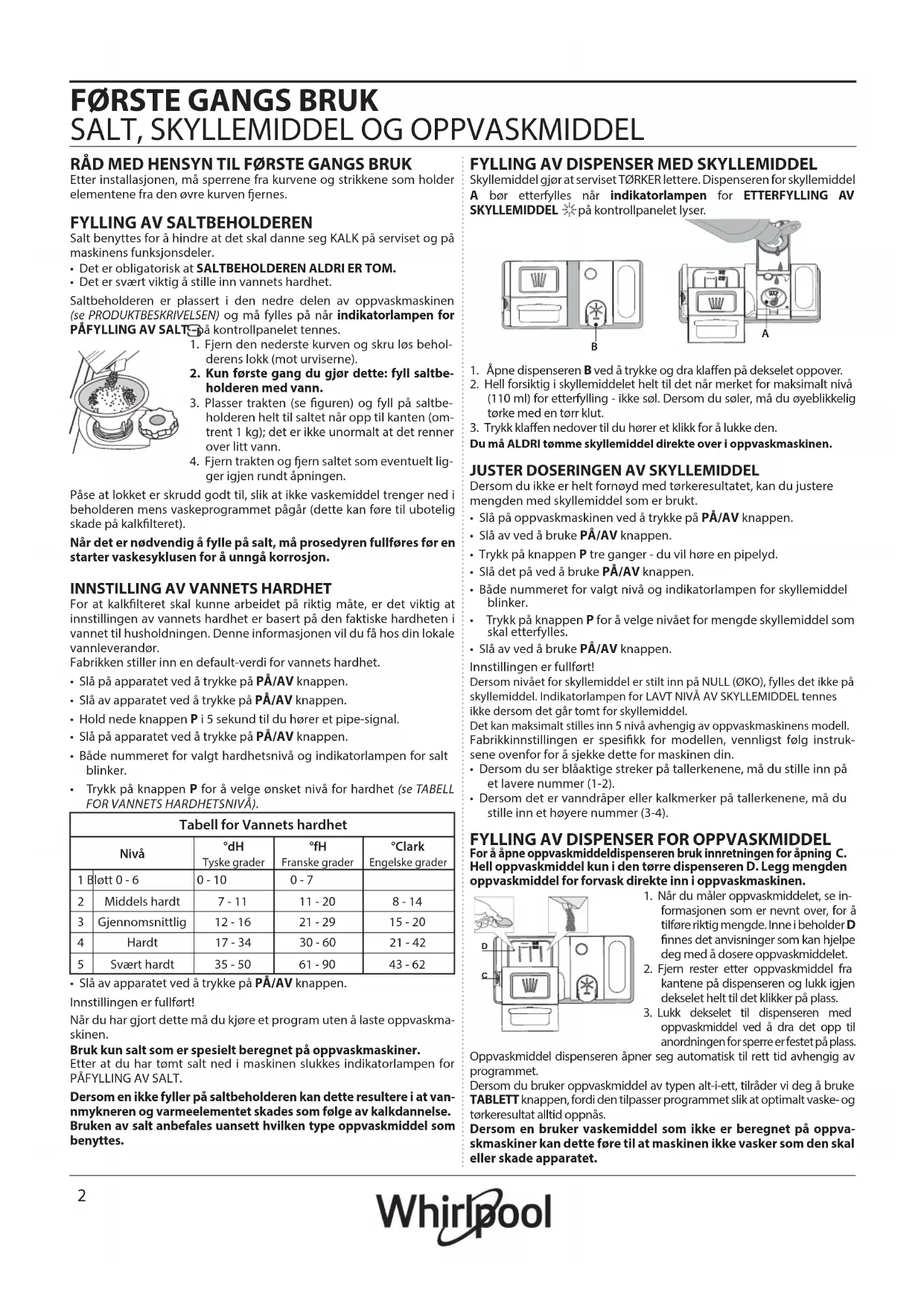- Trykk på knappen P for å velge ønsket nivå for hardhet (se TABELL FOR VANNETS HARDHETSNIVÅ).• Slå av apparatet ved å trykke på PÅ/AV knappen.Innstillingen er fullført!Når du har gjort dette må du kjøre et program uten å laste oppvaskma-skinen.Bruk kun salt som er spesielt beregnet på oppvaskmaskiner.Etter at du har tømt salt ned i maskinen slukkes indikatorlampen for PÅFYLLING AV SALT.Dersom en ikke fyller på saltbeholderen kan dette resultere i at van-nmykneren og varmeelementet skades som følge av kalkdannelse.Bruken av salt anbefales uansett hvilken type oppvaskmiddel som benyttes.