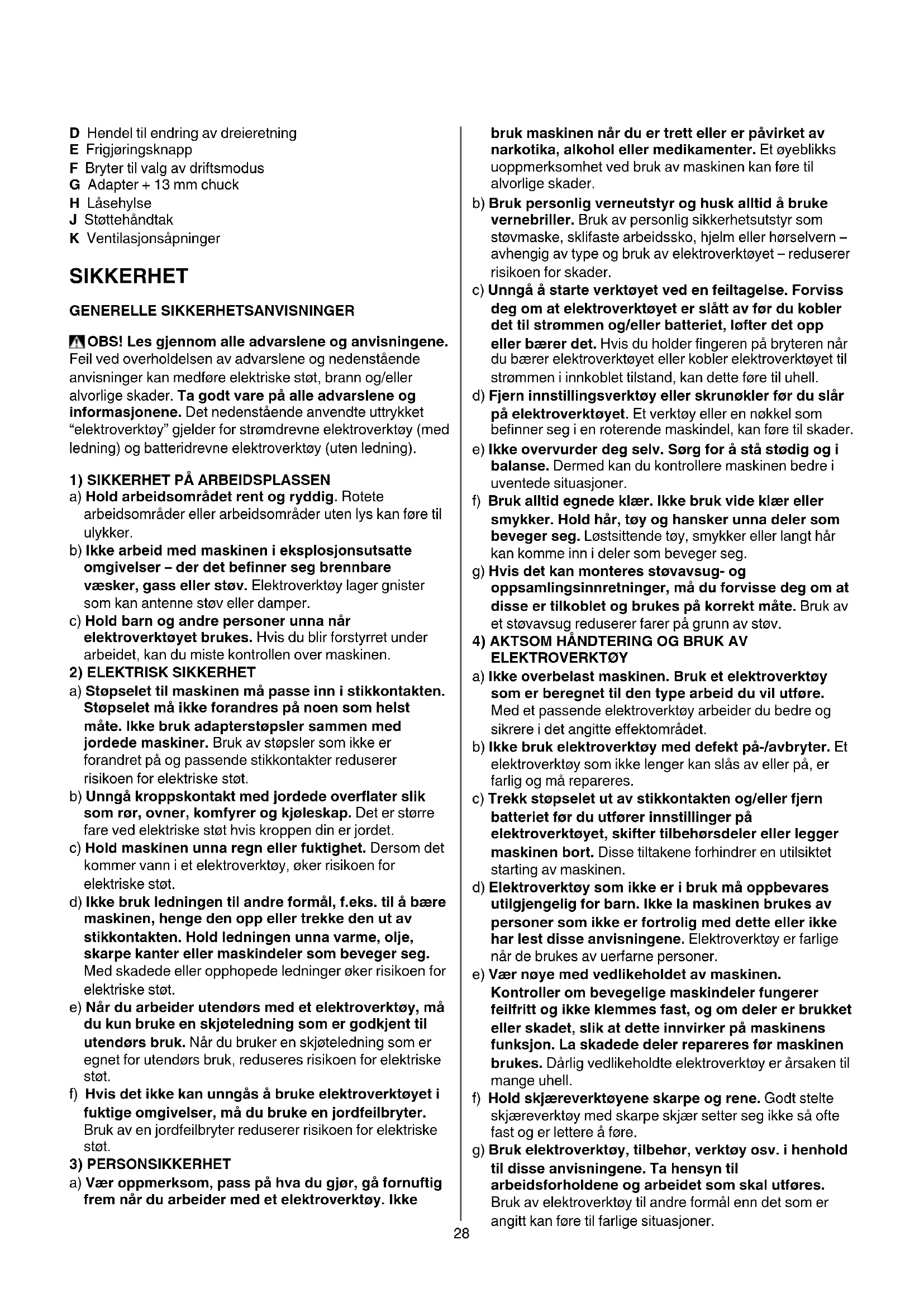 - Les og ta vare på denne brukerveiledningen 3 TEKNISKE DATA 1 ✱) Enkeltslagstyrke tilsvarende EPTA-Procedure 05/2009 (verdi ikke tilgjengelig enda) VERKTØYELEMENTER 2 A Bryter til av/på og turtallsregulering B Knapp til låsing av bryteren C Hjul for maksimumshastighetsregulering28 D Hendel til endring av dreieretning E Frigjøringsknapp F Bryter til valg av driftsmodus G Adapter + 13 mm chuck H Låsehylse J Støttehåndtak K Ventilasjonsåpninger SIKKERHET GENERELLE SIKKERHETSANVISNINGER OBS! Les gjennom alle advarslene og anvisningene. Feil ved overholdelsen av advarslene og nedenstående anvisninger kan medføre elektriske støt, brann og/eller alvorlige skader. Ta godt vare på alle advarslene og informasjonene. Det nedenstående anvendte uttrykket “elektroverktøy” gjelder for strømdrevne elektroverktøy (med ledning) og batteridrevne elektroverktøy (uten ledning).