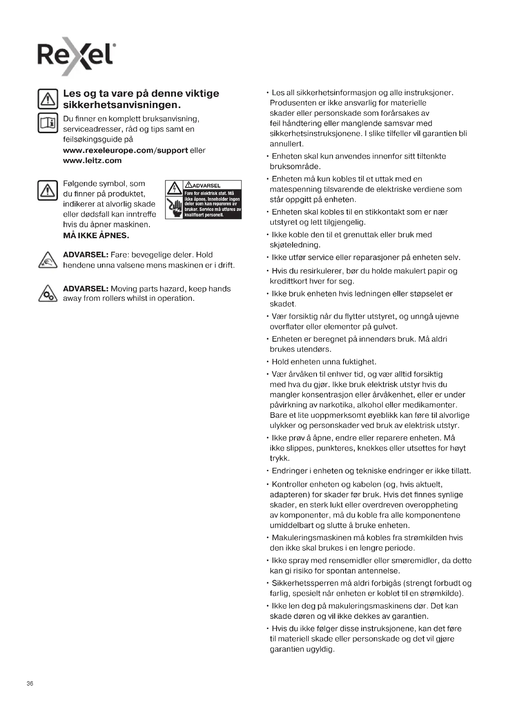 - Hvis du ikke følger disse instruksjonene, kan det føre til materiell skade eller personskade og det vil gjøre garantien ugyldig. Les og ta vare på denne viktige sikkerhetsanvisningen. Du finner en komplett bruksanvisning, serviceadresser, råd og tips samt en feilsøkingsguide på www.rexeleurope.com/support eller www.leitz.com ADVARSEL: Fare: bevegelige deler. Hold hendene unna valsene mens maskinen er i drift. ADVARSEL: Moving parts hazard, keep hands away from rollers whilst in operation.373737 Hold løstsittende smykker borte fra innmatingsåpningen Hold slips og løstsittende klær borte fra innmatingsåpningen Varselsymboler Hold langt hår borte fra innmatingsåpningen Ikke putt hånden eller fingrene inn i innmatingsåpningen Varselsymboler Arkkapasitet Ingen CD-er Ingen kraftige stifter over 26 mm Advarsel: bevegelige deler Dette utstyret skal ikke brukes av barn Ikke bruk aerosolspray på maskinen. Ikke spray med rensemidler eller smøremidler, da dette kan gi risiko for spontan antennelse. Ikon Type Glidebryter/indikator og handling (feilsøking) Kontrollknapper Knapp for automatisk start og standby (trykk én gang) Manuell reversknapp (hold nede) Knapp for manuell fremoverkjøring (hold nede) Indikator for overoppheting (la makuleringsmaskinen kjøle seg ned) Indikator for overbelastning/papirstopp (reduser antall ark / fjern papiret som har stoppet) Modeller med trykknapper Ikon Type Glidebryter/indikator og handling (feilsøking) Glidebryter Automatisk start (skyv til posisjon for makulering) Revers (skyv til posisjon) Fremover (skyv til posisjon) Statusindikatorer Av (skyv til posisjon) Indikator for klar (sørg for at makuleringshodet er på kurven og at glidebryteren er i automatisk startposisjon) Indikator for overoppheting (la makuleringsmaskinen kjøle seg ned) Kontrollpanel og indikatorer Modeller med glidebryter Ingen kredittkort Tilbehør Bruk kun Rexel-tilbehør: Oljeark (20) - 2101949 Oljeark (12) - 210194838 Tykt papir eller papp < 200 g. Flere sammenbrettede ark (A3-ark brettet på midten). Glanset papir eller ark dekket med utskrift på begge sider. CD-er og DVD-er Ikke bruk aerosolspray Ingen olje, bare oljeplater Makuleringsevne KAN makulere følgende: