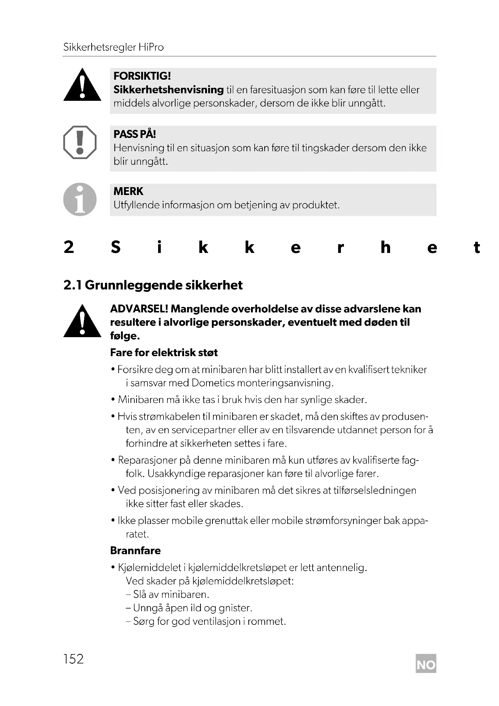 - Kjølemiddelet i kjølemiddelkretsløpet er lett antennelig. Ved skader på kjølemiddelkretsløpet: – Slå av minibaren. – Unngå åpen ild og gnister. – Sørg for god ventilasjon i rommet. FORSIKTIG! Sikkerhetshenvisning til en faresituasjon som kan føre til lette eller middels alvorlige personskader, dersom de ikke blir unngått. PASS PÅ! Henvisning til en situasjon som kan føre til tingskader dersom den ikke blir unngått. MERK Utfyllende informasjon om betjening av produktet. DometicHiPro30-40_OPM_4445103227_EMEA25_xxxx-xx-xx.book Seite 152 Freitag, 16. April 2021 2:47 14NO HiPro Sikkerhetsregler