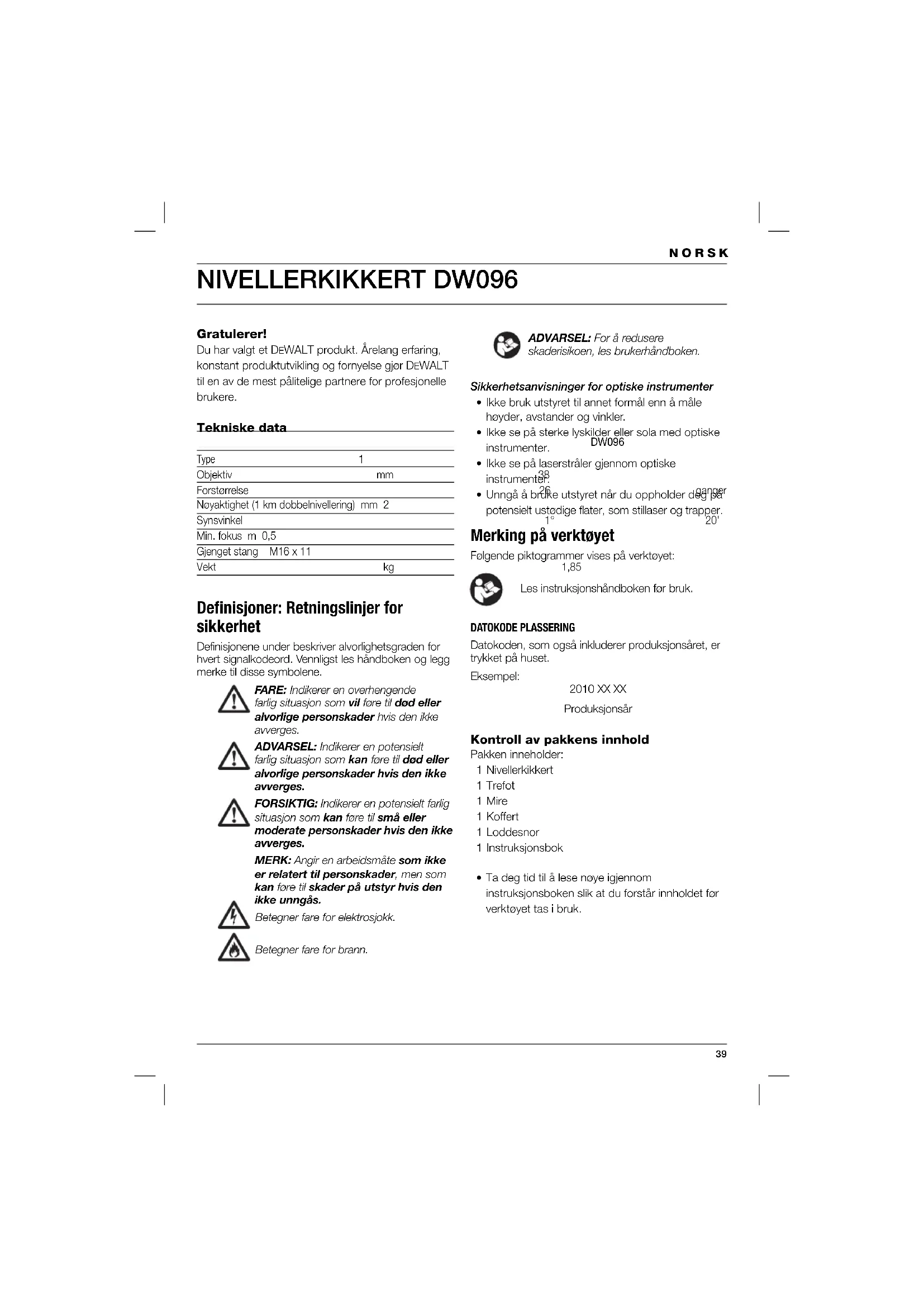 - Unngå å bruke utstyret når du oppholder deg på potensielt ustødige fl ater, som stillaser og trapper. Merking på verktøyet Følgende piktogrammer vises på verktøyet: Les instruksjonshåndboken før bruk. DATOKODE PLASSERING Datokoden, som også inkluderer produksjonsåret, er trykket på huset. Eksempel: 2010 XX XX Produksjonsår Kontroll av pakkens innhold Pakken inneholder: 1 Nivellerkikkert 1 Trefot 1 Mire 1 Koffert 1 Loddesnor 1 Instruksjonsbok