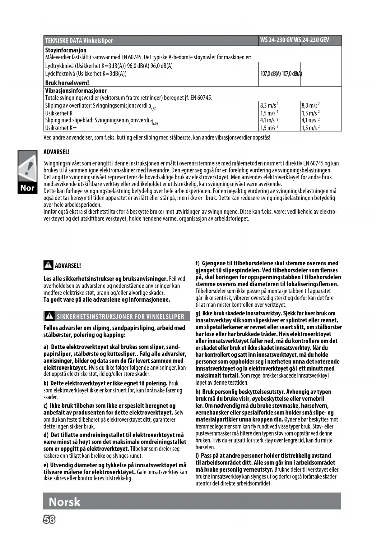 ger eller gjenstander som kan forårsake tilbakeslag.58 Nor Norsk Spesielle advarsler om sandpapirsliping: a) Ikke bruk overdimensjonerte slipeskiver, følg produ- sentens informasjoner om slipepapir-størrelsen. Slipeskiver som peker ut over slipetallerkenen kan forårsake skader og føre til at slipeskivene blokkerer eller revner eller til at det oppstår tilbakeslag. Spesielle advarsler for arbeid med stålbørster: a) Vær oppmerksom på at stålbørsten også ved normal bruk mister deler. Ikke overbelast børsten med for høyt trykk. Stålpartiklene som løsner kan lett trenge gjennom tynne klær og/eller inn i huden. b) Hvis det anbefales å bruke et vernedeksel, må du forhindre at vernedekselet og stålbørsten kan berøre hverandre. Tallerken- og koppbørster kan få større diameter med presstrykk og sentrifugalkrefter. Ytterlige sikkerhets- og arbeidsinstruksjoner Ved sliping av metall yr det gnister. Pass på at ingen personer blir utsatt for fare. På grunn av brannfaren må det ikke nnes noen brennbare materialer i nærheten (gnistområdet). Ikke bruk støvavsug. Unngå at yvende gnister og slipestøv treer kroppen. Ikke grip inn i fareområdet mens maskinen er i gang. Spon eller iser må ikke ernes mens maskinen er i gang. Slå straks av apparat når det oppstår store svingninger eller du fastslår andre mangler. Kontroller maskinen for å fastslå årsaken. Under ekstreme bruksforhold (f.eks. ved glattsliping av metall med støtteskive og vulkanber-slipeskiver) kan det legge seg mye skitt inne i vinkelsliperen. Ved slike bruksforhold er det av sikker- hetsgrunner nødvendig med innvendig rengjøring for å erne metallrester, det er dessuten tvingende nødvendig å montere en jordfeil- (FI) bryter. Hvis FI-bryteren reagerer må maskinen innsendes til reparasjon. På grunn av kortslutningsfare må metalldeler ikke komme inn i lufteåpningene. NETTILKOPLING Skal bare tilsluttes enfasevekselstrøm og bare til den på skiltet angitte nettspenning. Tilslutning til stikkontakter uten jordet kon- takt er mulig fordi beskyttelse beskyttelsesklasse II er forhanden. Stikkontakter utendørs må være utstyrt med feilstrøm-sikkerhets- bryter (FI,RCD,PRCD). Dette forlanges av installasjonsforskriften for elektroanlegg. Vennligst følg dette når du bruker vårt apparat. Maskinen må være slått av når den koples til stikkontakten. WS 22-180, WS 22-230, WS 24-230 GV: Innkoplingsprosesser frembringer korte spenningsfall. Ved ugunstige nettforhold kan andre apparater påvirkes. Ved nettimpedanser som er mindre enn 0,2 Ohm forventes ingen forstyrrelser.