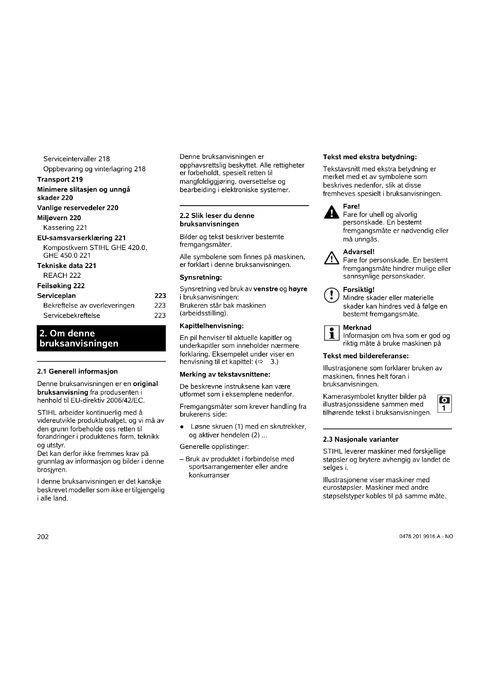 Denne bruksanvisningen er en original bruksanvisning fra produsenten i henhold til EU-direktiv 2006/42/EC. STIHL arbeider kontinuerlig med å videreutvikle produktutvalget, og vi må av den grunn forbeholde oss retten til forandringer i produktenes form, teknikk og utstyr. Det kan derfor ikke fremmes krav på grunnlag av informasjon og bilder i denne brosjyren. I denne bruksanvisningen er det kanskje beskrevet modeller som ikke er tilgjengelig i alle land. Denne bruksanvisningen er opphavsrettslig beskyttet. Alle rettigheter er forbeholdt, spesielt retten til mangfoldiggjøring, oversettelse og bearbeiding i elektroniske systemer.