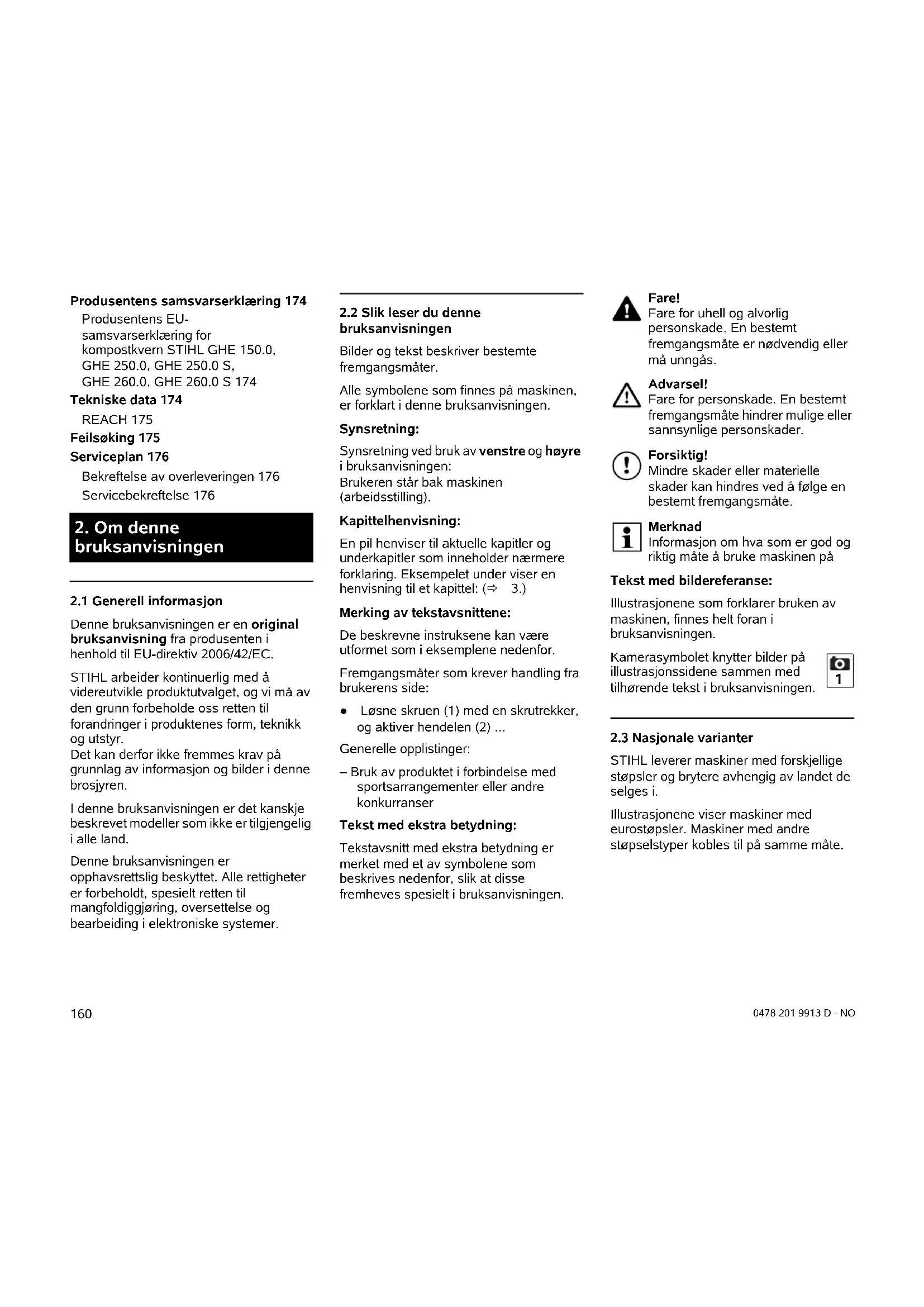 bruksanvisningen Bilder og tekst beskriver bestemte fremgangsmåter. Alle symbolene som finnes på maskinen, er forklart i denne bruksanvisningen. Synsretning: Synsretning ved bruk av venstre og høyre i bruksanvisningen: Brukeren står bak maskinen (arbeidsstilling). Kapittelhenvisning: En pil henviser til aktuelle kapitler og underkapitler som inneholder nærmere forklaring. Eksempelet under viser en henvisning til et kapittel: (Ö 3.) Merking av tekstavsnittene: De beskrevne instruksene kan være utformet som i eksemplene nedenfor. Fremgangsmåter som krever handling fra brukerens side: ● Løsne skruen (1) med en skrutrekker, og aktiver hendelen (2) ... Generelle opplistinger: – Bruk av produktet i forbindelse med sportsarrangementer eller andre konkurranser Tekst med ekstra betydning: Tekstavsnitt med ekstra betydning er merket med et av symbolene som beskrives nedenfor, slik at disse fremheves spesielt i bruksanvisningen. Tekst med bildereferanse: Illustrasjonene som forklarer bruken av maskinen, finnes helt foran i bruksanvisningen. Kamerasymbolet knytter bilder på illustrasjonssidene sammen med tilhørende tekst i bruksanvisningen.