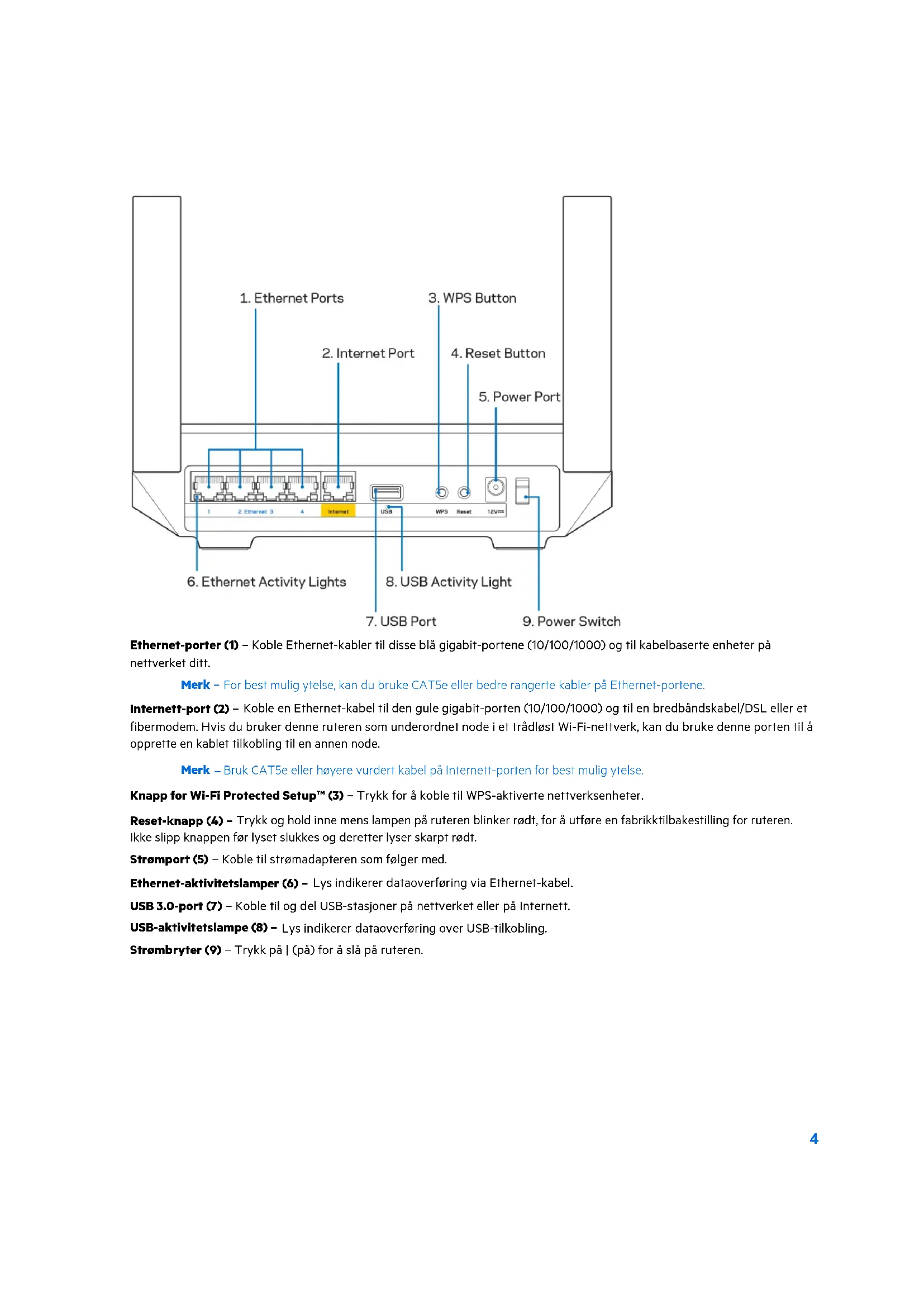 Merk - For best mulig ytelse, kan du bruke CAT5e ell er bedre rangerte kabler pa Ethernet-portene.