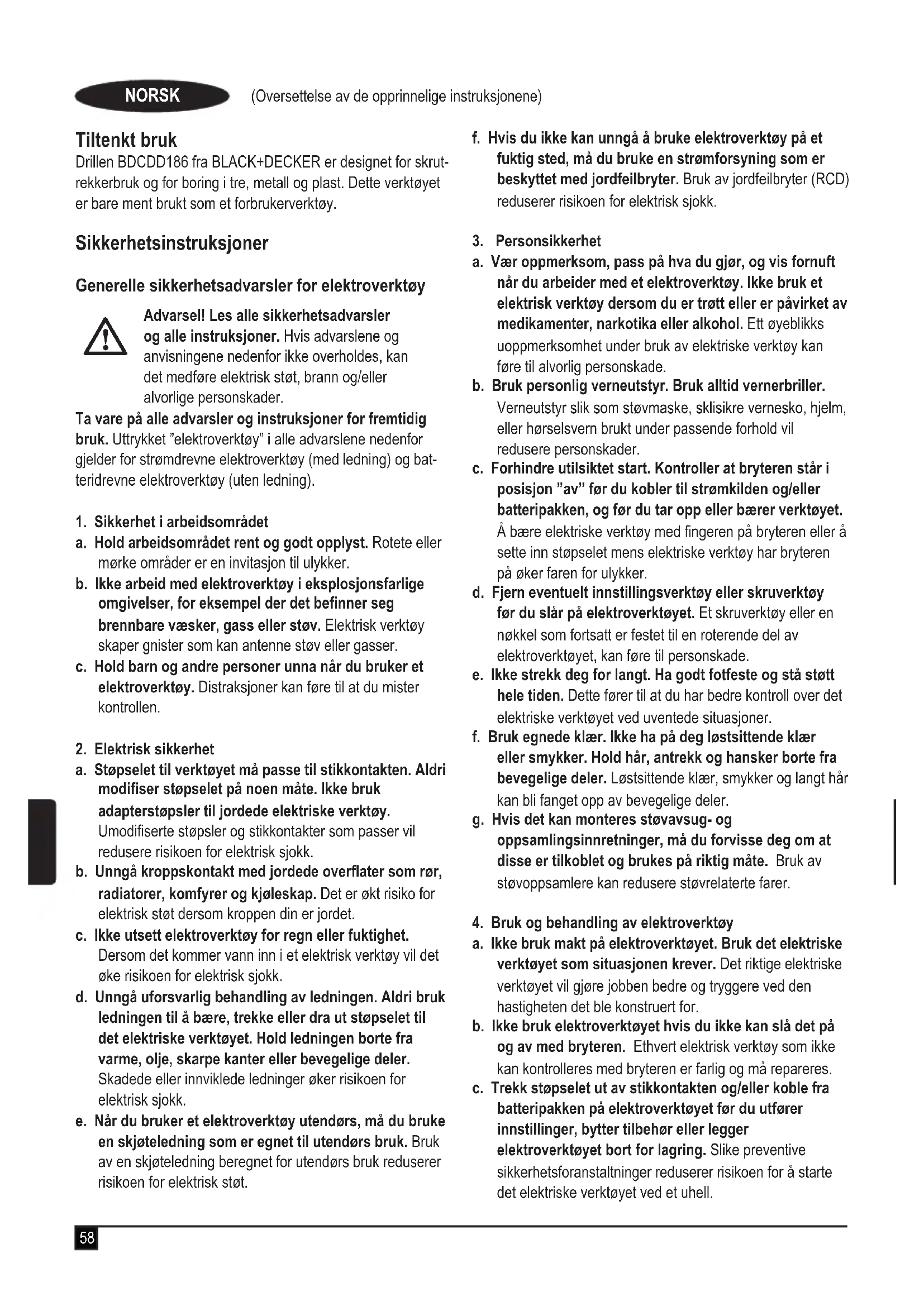 Hvis strømledningen blir skadet, ma den byttes av produsenten erler et autorisert BLACK+DECKER-service-senter for a unngå fare.