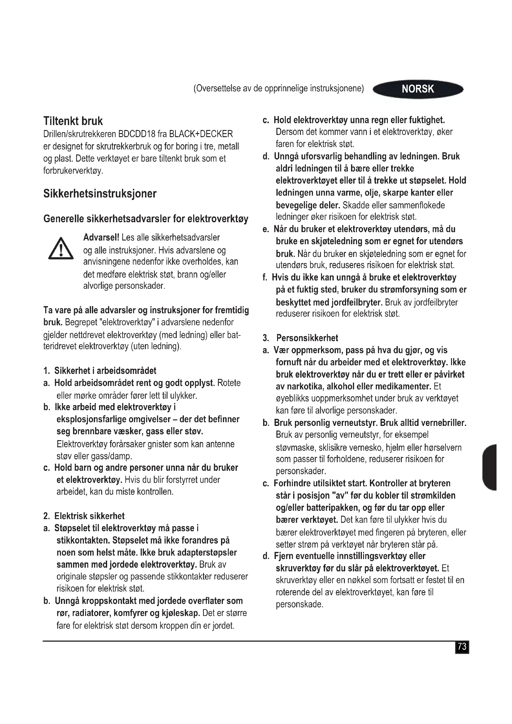 -symbolet. u Ved bruk som skrutrekker settes mansjetten i ønsket stilling. Hvis du ikke vet hva som er riktig innstilling ennå, går du frem slik: u Sett momentjusteringsmansjetten (4) på laveste momentinnstilling. u Stram til den første skruen. u Hvis koblingen lager en klikkelyd før du oppnår ønsket resultat, øker du mansjettinnstillingen og fortsetter å stramme skruen. Gjenta til du når korrekt innstilling. Bruk denne innstillingen for de gjenværende skruene. Boring / bruk som skrutrekker u Velg rotasjon fremover eller bakover med glidebry- teren for fremover/bakover (2). u Trykk på bryteren (1) for å slå verktøyet på. Hastigheten til verktøyet avhenger av hvor langt inn du trykker bryteren. u Slipp bryteren for å slå verktøyet av.78 (Oversettelse av de opprinnelige instruksjonene) NORSK Råd for optimal bruk Boring u Benytt alltid lett trykk i rett linje med boret. u Like før boret bryter gjennom på den andre siden av arbeidsstykket, reduserer du trykket på verktøyet. u Bruk et trestykke på baksiden av arbeidsstykker som kan bli splintret. u Bruk spissbor når du borer hull med stor diameter i tre. u Bruk HSS-bor når du borer i metall. u Bruk murbor når du borer i bløt mur. u Bruk et smøremiddel når du borer i metall bortsett fra støpejern og messing. u Lag en fordypning med en dor midt i hullet som skal bores, for å øke nøyaktigheten. Bruk som skrutrekker u Bruk alltid riktig type og størrelse av skrutrekkerbit. u Hvis skruer er vanskelige å stramme, prøver du å bruke litt ytende vaskemiddel eller såpe som smøremiddel. u Hold alltid verktøyet og skrutrekkerbiten i rett linje med skruen Vedlikehold BLACK+DECKER-verktøyet ditt er konstruert for å være i drift over lengre tid med et minimum av vedlikehold. Det er avhengig av riktig stell og regelmessig rengjøring for å fungere som det skal til enhver tid. Laderen krever ikke annet vedlikehold enn regelmessig rengjøring. Advarsel! Før du utfører vedlikehold på verktøyet, må du fjerne batteriet fra verktøyet. Koble laderen fra nettstrøm- men før du rengjør den. u Rengjør ventilasjonsåpningene i verktøyet og laderen jevnlig med en myk børste eller tørr klut. u Rengjør motorhuset jevnlig med en fuktig klut. Ikke bruk slipende eller løsemiddelbaserte rengjørings- midler. u Åpne chucken regelmessig, og bank på den for å fjerne eventuelt støv fra innsiden. Miljø
