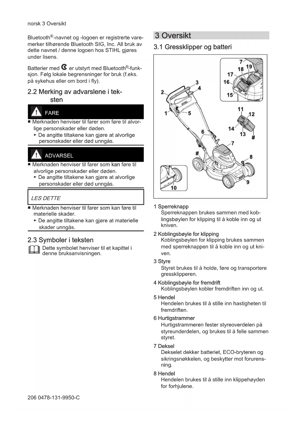 Hvis det virvles opp støv: Ha på deg støv‐ maske. norsk 4 Sikkerhetsforskrifter 208 0478-131-9950-C■ Uegnet bekledning kan hekte seg i trær, busker eller selve gressklipperen. Brukere som ikke benytter egnet bekledning, kan få alvorlige skader.