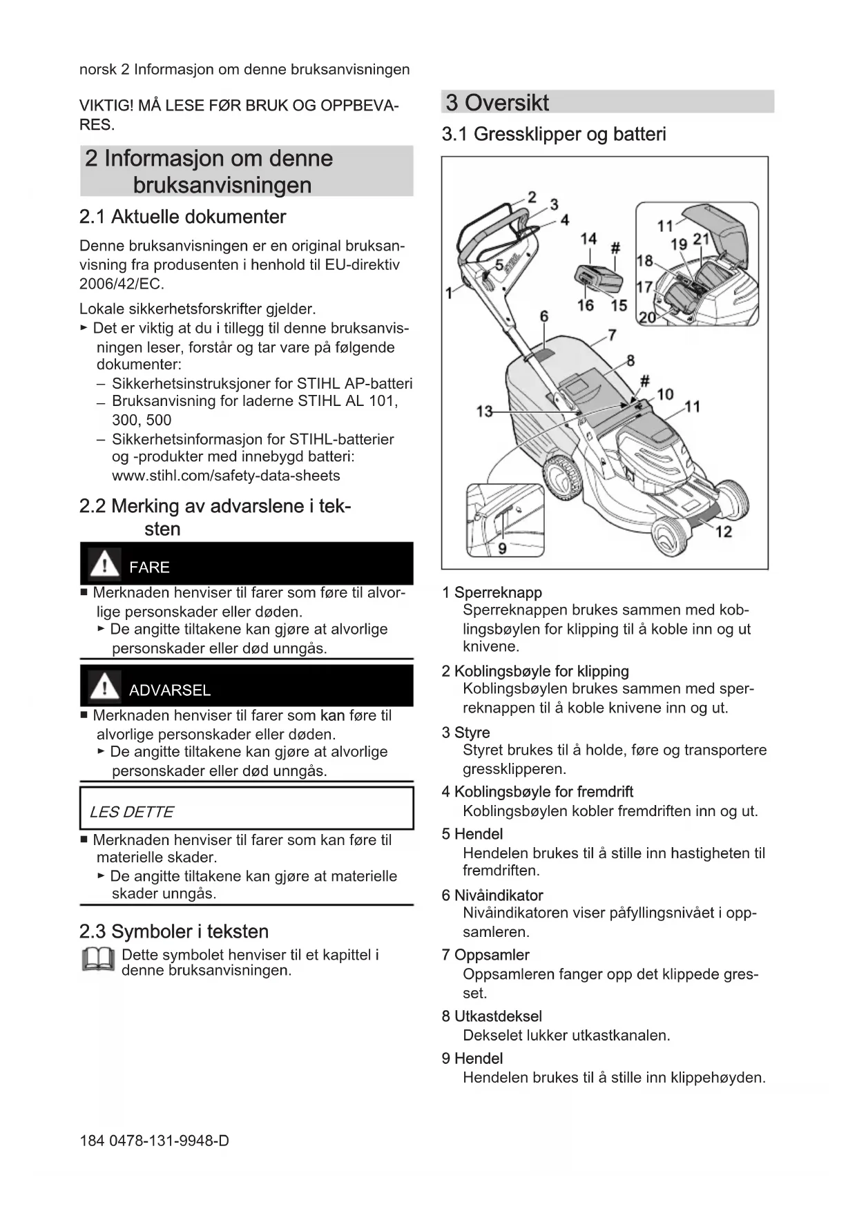 1 Sperreknapp Sperreknappen brukes sammen med kob‐ lingsbøylen for klipping til å koble inn og ut knivene. 2 Koblingsbøyle for klipping Koblingsbøylen brukes sammen med sper‐ reknappen til å koble knivene inn og ut. 3 Styre Styret brukes til å holde, føre og transportere gressklipperen. 4 Koblingsbøyle for fremdrift Koblingsbøylen kobler fremdriften inn og ut. 5 Hendel Hendelen brukes til å stille inn hastigheten til fremdriften. 6 Nivåindikator Nivåindikatoren viser påfyllingsnivået i opp‐ samleren. 7 Oppsamler Oppsamleren fanger opp det klippede gres‐ set. 8 Utkastdeksel Dekselet lukker utkastkanalen. 9 Hendel Hendelen brukes til å stille inn klippehøyden. norsk 2 Informasjon om denne bruksanvisningen 184 0478-131-9948-D10 Håndtak Håndtaket brukes til å holde gressklipperen ved innstilling av klippehøyde og transport av gressklipperen. 11 Deksel Dekselet dekker batteriet og sikringsnøkke‐ len. 12 Transporthåndtak Håndtaket brukes til å transportere gressklip‐ peren. 13 Hendel Hendelen brukes til å stille inn og felle sam‐ men styret. 14 Batteri Batteriet forsyner gressklipperen med strøm. 15 Trykknapp Trykknappen aktiverer lysdiodene på batte‐ riet. 16 Lysdioder Lysdiodene viser batteriets ladetilstand samt eventuelle feil. 17 Batterirom Batteriet befinner seg i batterirommet. 18 ECO-bryter ECO-bryteren brukes til å slå ECO-modus av og på. 19 Sikringsnøkkel Sikringsnøkkelen aktiverer gressklipperen. 20 Sperrearmen holder batteriet på plass i batte‐ rirommet. RMA 443.2 PV, RMA 448.2 PV: 21 Batterirom Batterirommet har plass til to batterier. RMA 443.2 VC, RMA 448.2 VC: 21 Transportrom Transportrommet har plass til et reservebat‐ teri. # Merkeplate med maskinnummer