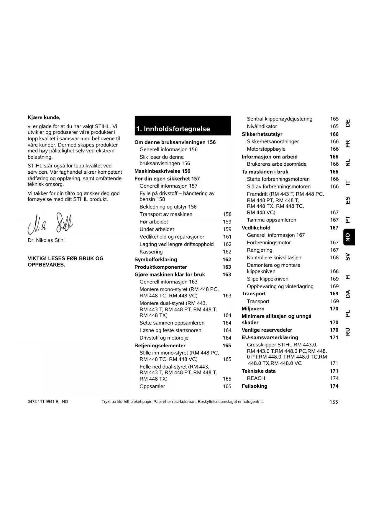 Om denne bruksanvisningen 156 Generell informasjon 156 Slik leser du denne bruksanvisningen 156 Maskinbeskrivelse 156 For din egen sikkerhet 157 Generell informasjon 157 Fylle på drivstoff – håndtering av bensin 158 Bekledning og utstyr 158 Transport av maskinen 158 Før arbeidet 159 Under arbeidet 159 Vedlikehold og reparasjoner 161 Lagring ved lengre driftsopphold 162 Kassering 162 Symbolforklaring 162 Produktkomponenter 163 Gjøre maskinen klar for bruk 163 Generell informasjon 163 Montere mono-styret (RM 448 PC, RM 448 TC, RM 448 VC) 163 Montere dual-styret (RM 443, RM 443 T, RM 448 PT, RM 448 T, RM 448 TX) 164 Sette sammen oppsamleren 164 Løsne og feste startsnoren 164 Drivstoff og motorolje 164 Betjeningselementer 165 Stille inn mono-styret (RM 448 PC, RM 448 TC, RM 448 VC) 165 Felle ned dual-styret (RM 443, RM 443 T, RM 448 PT, RM 448 T, RM 448 TX) 165 Oppsamler 165 Sentral klippehøydejustering 165 Nivåindikator 165 Sikkerhetsutstyr 166 Sikkerhetsanordninger 166 Motorstoppbøyle 166 Informasjon om arbeid 166 Brukerens arbeidsområde 166 Ta maskinen i bruk 166 Starte forbrenningsmotoren 166 Slå av forbrenningsmotoren 166 Fremdrift (RM 443 T, RM 448 PC, RM 448 PT, RM 448 T, RM 448 TX, RM 448 TC, RM 448 VC) 167 Tømme oppsamleren 167 Vedlikehold 167 Generell informasjon 167 Forbrenningsmotor 167 Rengjøring 167 Kontrollere knivslitasjen 168 Demontere og montere klippekniven 168 Slipe klippekniven 169 Oppbevaring og vinterlagring 169 Transport 169 Transport 169 Miljøvern 170 Minimere slitasjen og unngå skader 170 Vanlige reservedeler 170 EU-samsvarserklæring 171 Gressklipper STIHL RM 443.0, RM 443.0 T,RM 448.0 PC,RM 448. 0 PT,RM 448.0 T,RM 448.0 TC,RM