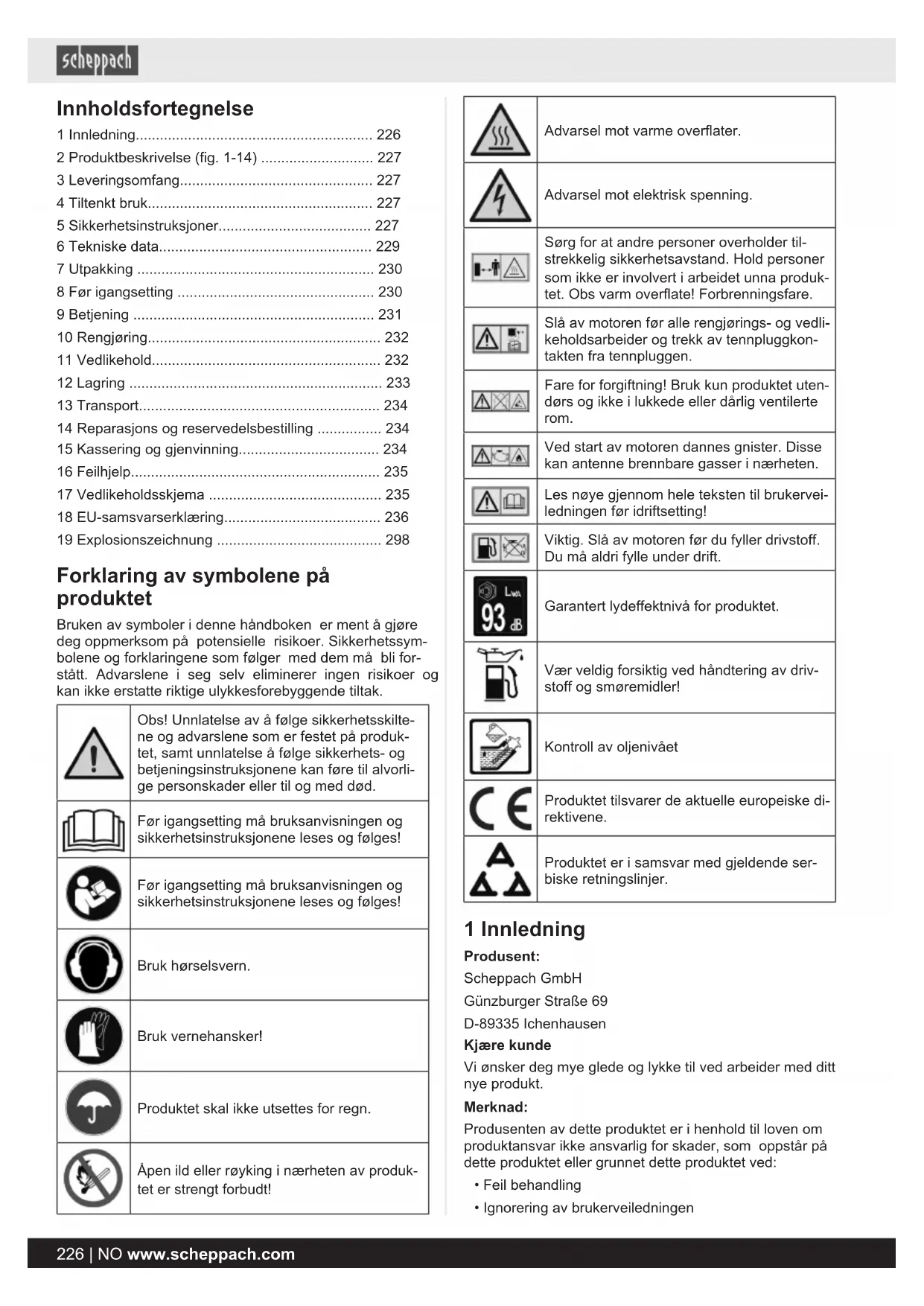 - 19 Explosionszeichnung Forklaring av symbolene på produktet Bruken av symboler i denne håndboken er ment å gjøre deg oppmerksom på potensielle risikoer. Sikkerhetssym- bolene og forklaringene som følger med dem må bli for- stått. Advarslene i seg selv eliminerer ingen risikoer og kan ikke erstatte riktige ulykkesforebyggende tiltak. Obs! Unnlatelse av å følge sikkerhetsskilte- ne og advarslene som er festet på produk- tet, samt unnlatelse å følge sikkerhets- og betjeningsinstruksjonene kan føre til alvorli- ge personskader eller til og med død. Før igangsetting må bruksanvisningen og sikkerhetsinstruksjonene leses og følges! Før igangsetting må bruksanvisningen og sikkerhetsinstruksjonene leses og følges! Bruk hørselsvern. Bruk vernehansker! Produktet skal ikke utsettes for regn. Åpen ild eller røyking i nærheten av produk- tet er strengt forbudt! Advarsel mot varme overflater. Advarsel mot elektrisk spenning. Sørg for at andre personer overholder til- strekkelig sikkerhetsavstand. Hold personer som ikke er involvert i arbeidet unna produk- tet. Obs varm overflate! Forbrenningsfare. Slå av motoren før alle rengjørings- og vedli- keholdsarbeider og trekk av tennpluggkon- takten fra tennpluggen. Fare for forgiftning! Bruk kun produktet uten- dørs og ikke i lukkede eller dårlig ventilerte rom. Ved start av motoren dannes gnister. Disse kan antenne brennbare gasser i nærheten. Les nøye gjennom hele teksten til brukervei- ledningen før idriftsetting! Viktig. Slå av motoren før du fyller drivstoff. Du må aldri fylle under drift. Garantert lydeffektnivå for produktet. Vær veldig forsiktig ved håndtering av driv- stoff og smøremidler! Kontroll av oljenivået Produktet tilsvarer de aktuelle europeiske di- rektivene. Produktet er i samsvar med gjeldende ser- biske retningslinjer. 1 Innledning Produsent: Scheppach GmbH Günzburger Straße 69 D-89335 Ichenhausen Kjære kunde Vi ønsker deg mye glede og lykke til ved arbeider med ditt nye produkt. Merknad: Produsenten av dette produktet er i henhold til loven om produktansvar ikke ansvarlig for skader, som oppstår på dette produktet eller grunnet dette produktet ved: p. 298