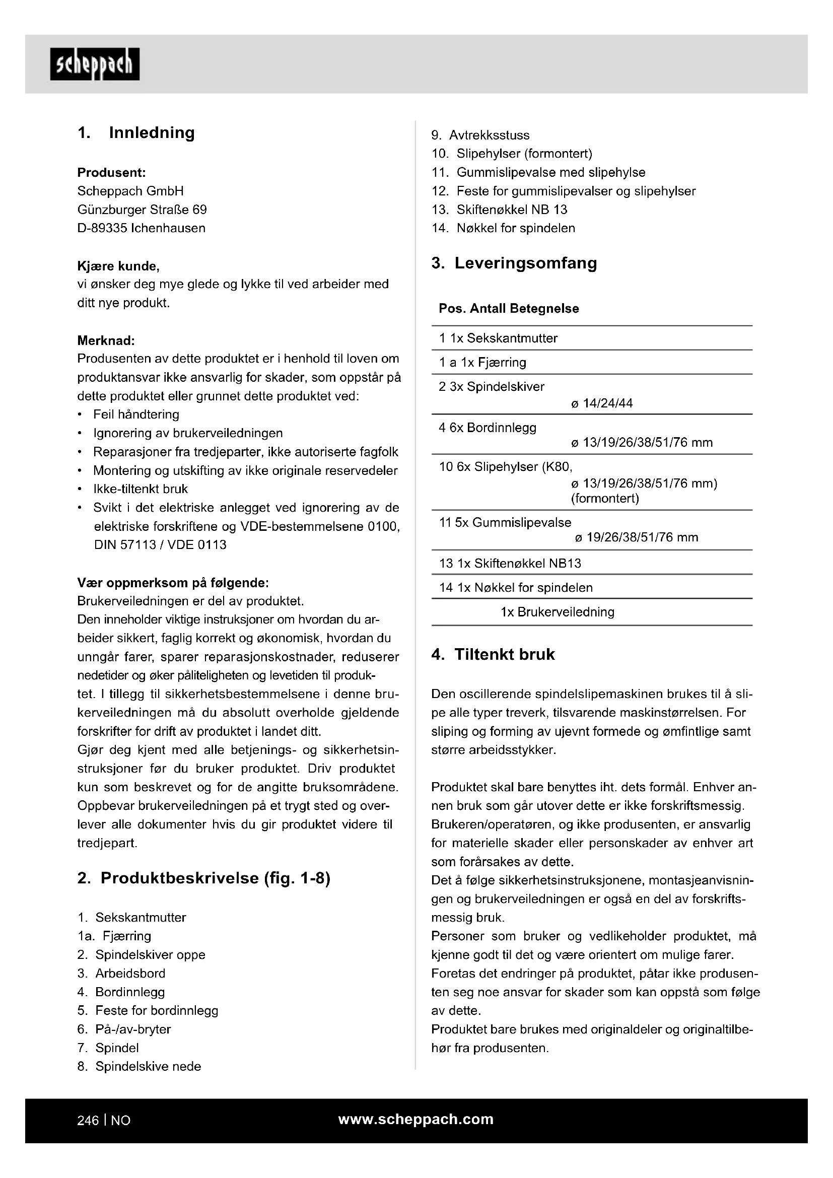 - Oppgi ved bestillinger våre artikkelnumre, samt type og byggeår for apparatet. m OBS! Apparatet og emballasjemateriale er ikke et leke- tøy! Barn skal ikke leke med plastposer, folier og smådeler! Det er fare for svelging og kvelning!www.scheppach.com