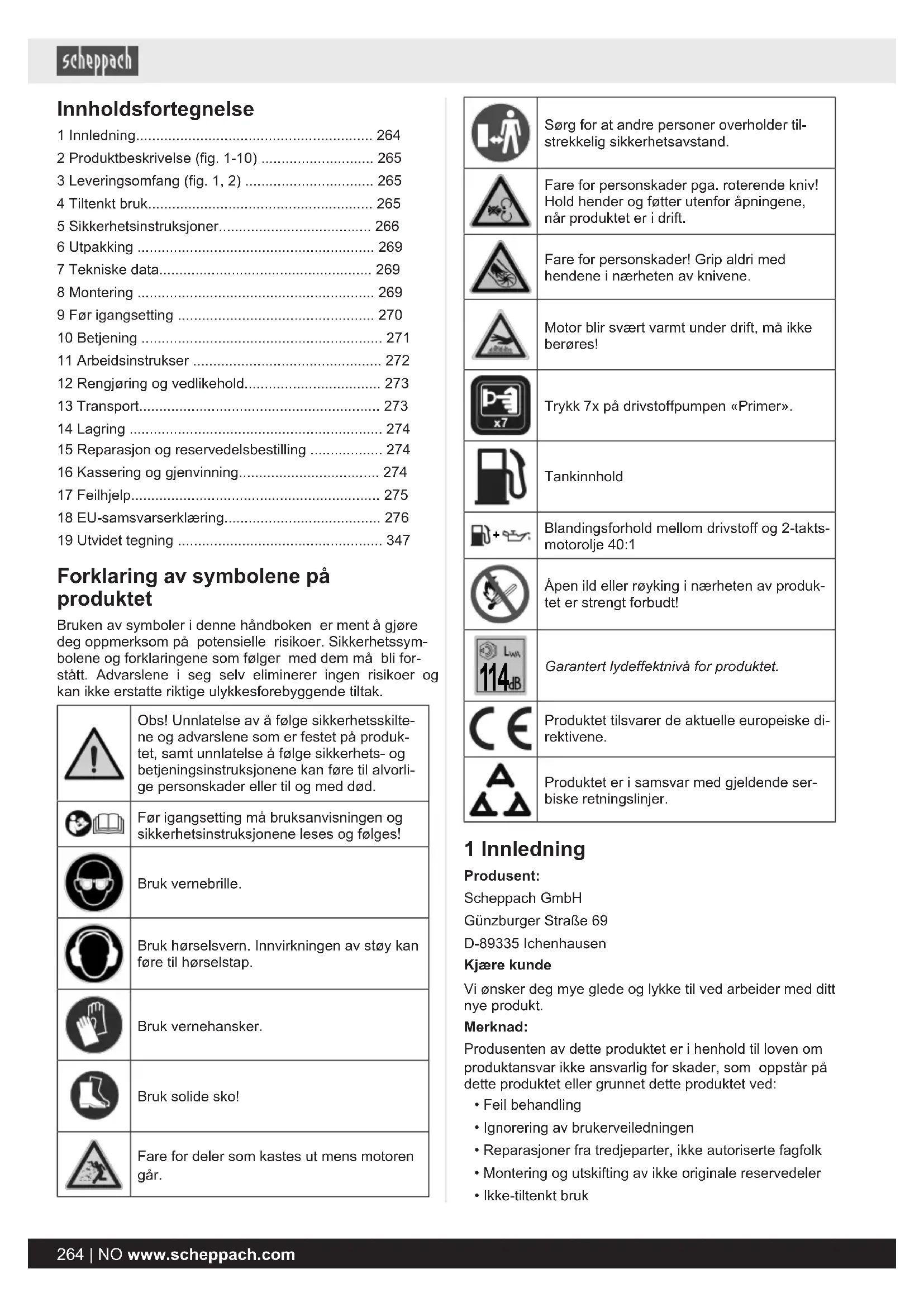 - For å samle opp løv eller generelt hageavfall som av- kapp eller for å fjerne dem fra vanskelig tilgjengelige steder. Produktet skal bare benyttes iht. dets formål. Enhver bruk som går utover dette er ikke tiltenkt. Brukeren, og ikke produsenten, er ansvarlig for materielle skader eller per- sonskader av enhver art som forårsakes av dette. Det å følge sikkerhetsinstruksjonene, montasjeanvisnin- gen og brukerveiledningen er også en del av forskrifts- messig bruk. Personer som bruker og vedlikeholder produktet, må kjenne godt til det og være orientert om mulige farer. Foretas det endringer på produktet, påtar ikke produsen- ten seg noe ansvar for skader som kan oppstå som følge av dette. Produktet bare brukes med originaldeler og originaltilbe- hør fra produsenten. Sikkerhets-, arbeids- og vedlikeholdsforskriftene til produ- senten og målene som er spesifisert i de tekniske datae- ne, må overholdes. Vennligst merk at våre produkter forskriftsmessig sett ikke ble konstruert for bruk innen handel, håndverk og industri. Vi påtar oss intet garantiansvar dersom produktet benyt- tes innen handel, håndverk eller industri, eller ved likestil- te aktiviteter. Forklaring av signalordene i brukerveiledningen FARE Signalord for å indikere en overhengende far- lig situasjon som, hvis den ikke unngås, vil resultere i død eller alvorlig personskade. ADVARSEL Signalord for å indikere en mulig farlig situa- sjon som, hvis den ikke unngås, kan føre til død eller alvorlig personskade. FORSIKTIG Signalord for å indikere en potensielt farlig situasjon som, hvis den ikke unngås, kan fø- re til mindre eller moderat personskade. OBS Signalord for å indikere en mulig farlig situa- sjon som, hvis den ikke unngås, kan føre til materielle skader på produktet eller eiendom/ eiendeler. NO | 265www.scheppach.com5 Sikkerhetsinstruksjoner Generelle sikkerhetsinstruksjoner ADVARSEL For din egen sikkerhet, vennligst les denne håndboken og de generelle sikkerhetsinstruksjonene grundig før du bruker produktet. Hvis du overlater produktet til tredje- parter, må du alltid inkludere denne bruksanvisningen. ADVARSEL Bruk kun drivstoff som er anbefalt i denne veiledningen. ADVARSEL Du må aldri bruke drivstoff som ikke er blandet med 2- taktsolje. Dette kan forårsake permanent motorskade og ugyldiggjøre produsentens garanti for dette produk- tet. Bruk aldri en drivstoffblanding som har vært lagret i mer enn 90 dager. Oppbevar alle sikkerhetsinstruksjoner og anvisninger for framtiden!
