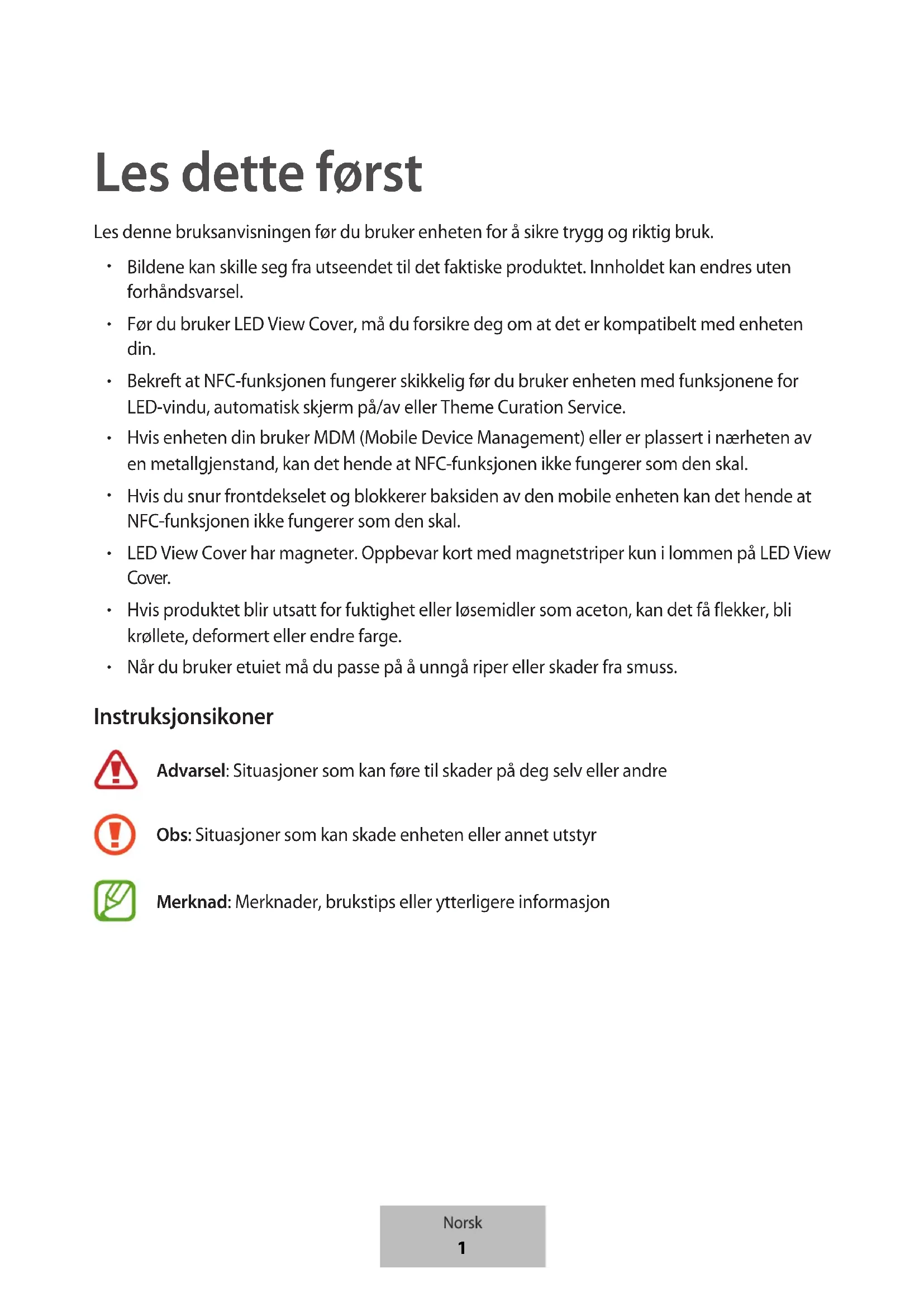 Når du bruker etuiet må du passe på å unngå riper eller skader fra smuss. Instruksjonsikoner Advarsel: Situasjoner som kan føre til skader på deg selv eller andre Obs: Situasjoner som kan skade enheten eller annet utstyr Merknad: Merknader, brukstips eller ytterligere informasjon Norsk