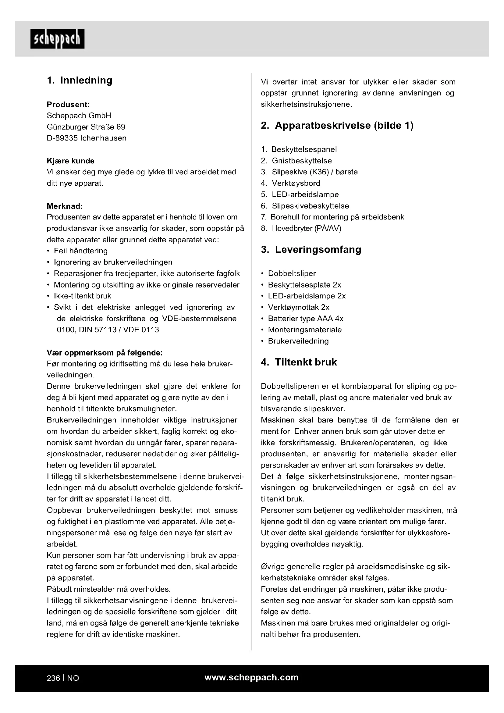 - Svikt i det elektriske anlegget ved ignorering av de elektriske forskriftene og VDE-bestemmelsene 0100, DIN 57113 / VDE 0113 Vær oppmerksom på følgende: Før montering og idriftsetting må du lese hele bruker- veiledningen. Denne brukerveiledningen skal gjøre det enklere for deg å bli kjent med apparatet og gjøre nytte av den i henhold til tiltenkte bruksmuligheter. Brukerveiledningen inneholder viktige instruksjoner om hvordan du arbeider sikkert, faglig korrekt og øko- nomisk samt hvordan du unngår farer, sparer repara- sjonskostnader, reduserer nedetider og øker pålitelig- heten og levetiden til apparatet. I tillegg til sikkerhetsbestemmelsene i denne brukervei- ledningen må du absolutt overholde gjeldende forskrif- ter for drift av apparatet i landet ditt. Oppbevar brukerveiledningen beskyttet mot smuss og fuktighet i en plastlomme ved apparatet. Alle betje- ningspersoner må lese og følge den nøye før start av arbeidet. Kun personer som har fått undervisning i bruk av appa- ratet og farene som er forbundet med den, skal arbeide på apparatet. Påbudt minstealder må overholdes. I tillegg til sikkerhetsanvisningene i denne brukervei- ledningen og de spesielle forskriftene som gjelder i ditt land, må en også følge de generelt anerkjente tekniske reglene for drift av identiske maskiner.www.scheppach.com