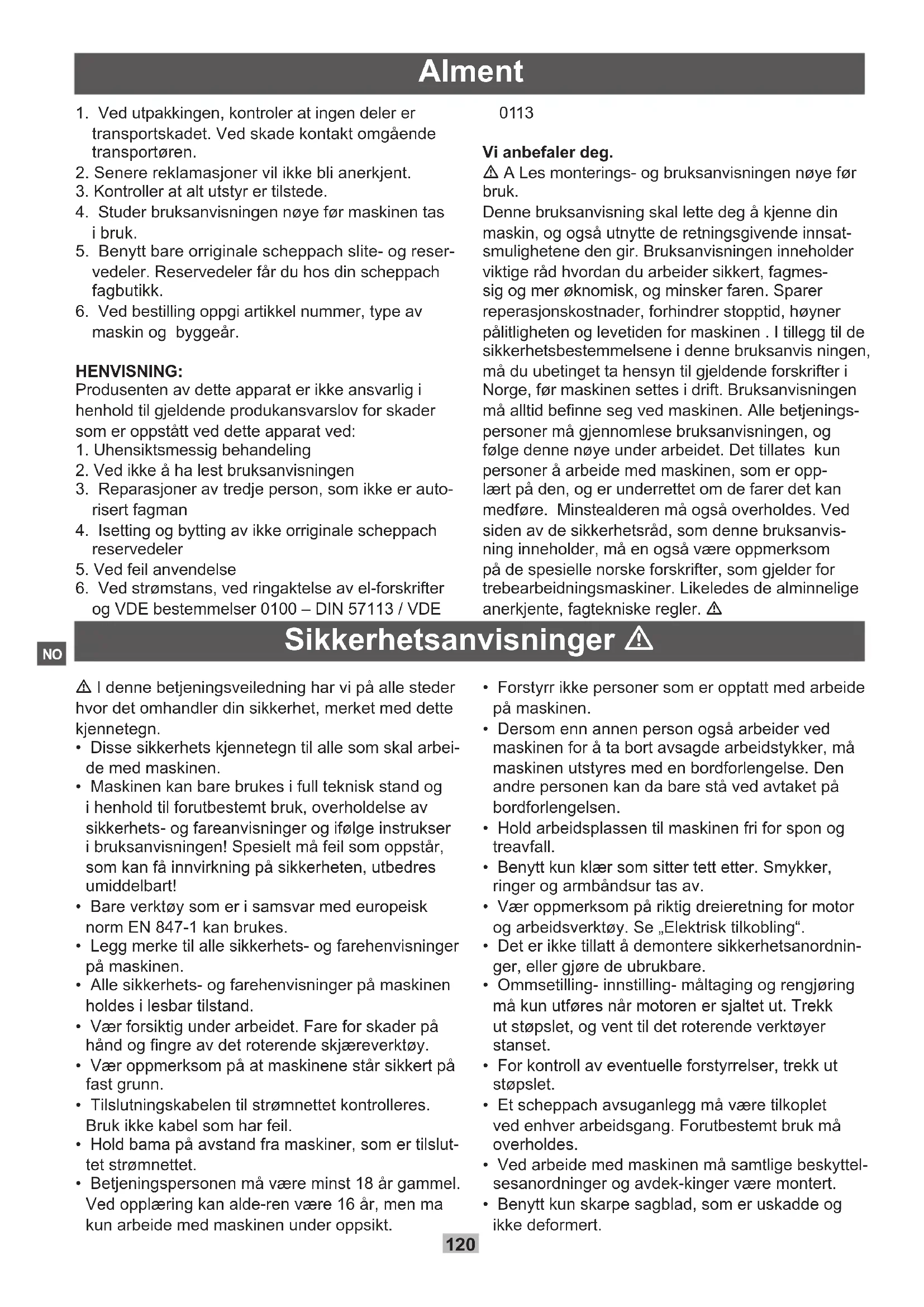 Vi anbefaler deg. A Les monterings- og bruksanvisningen nøye før bruk. Denne bruksanvisning skal lette deg å kjenne din maskin, og også utnytte de retningsgivende innsat- smulighetene den gir. Bruksanvisningen inneholder viktige råd hvordan du arbeider sikkert, fagmes- sig og mer øknomisk, og minsker faren. Sparer reperasjonskostnader, forhindrer stopptid, høyner pålitligheten og levetiden for maskinen . I tillegg til de sikkerhetsbestemmelsene i denne bruksanvis ningen, må du ubetinget ta hensyn til gjeldende forskrifter i Norge, før maskinen settes i drift. Bruksanvisningen må alltid benne seg ved maskinen. Alle betjenings- personer må gjennomlese bruksanvisningen, og følge denne nøye under arbeidet. Det tillates kun personer å arbeide med maskinen, som er opp- lært på den, og er underrettet om de farer det kan medføre. Minstealderen må også overholdes. Ved siden av de sikkerhetsråd, som denne bruksanvis- ning inneholder, må en også være oppmerksom på de spesielle norske forskrifter, som gjelder for trebearbeidningsmaskiner. Likeledes de alminnelige anerkjente, fagtekniske regler. Sikkerhetsanvisninger I denne betjeningsveiledning har vi på alle steder hvor det omhandler din sikkerhet, merket med dette kjennetegn.