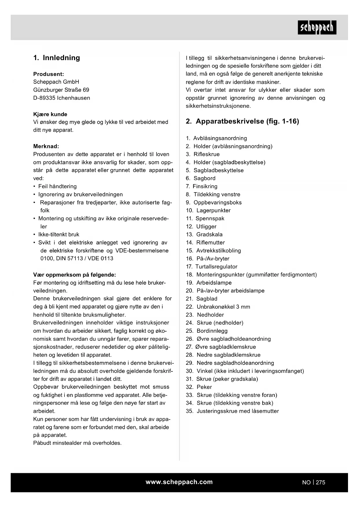 Produsent: Scheppach GmbH Günzburger Straße 69 D-89335 Ichenhausen Kjære kunde Vi ønsker deg mye glede og lykke til ved arbeidet med ditt nye apparat. Merknad: Produsenten av dette apparatet er i henhold til loven om produktansvar ikke ansvarlig for skader, som opp- står på dette apparatet eller grunnet dette apparatet ved:
