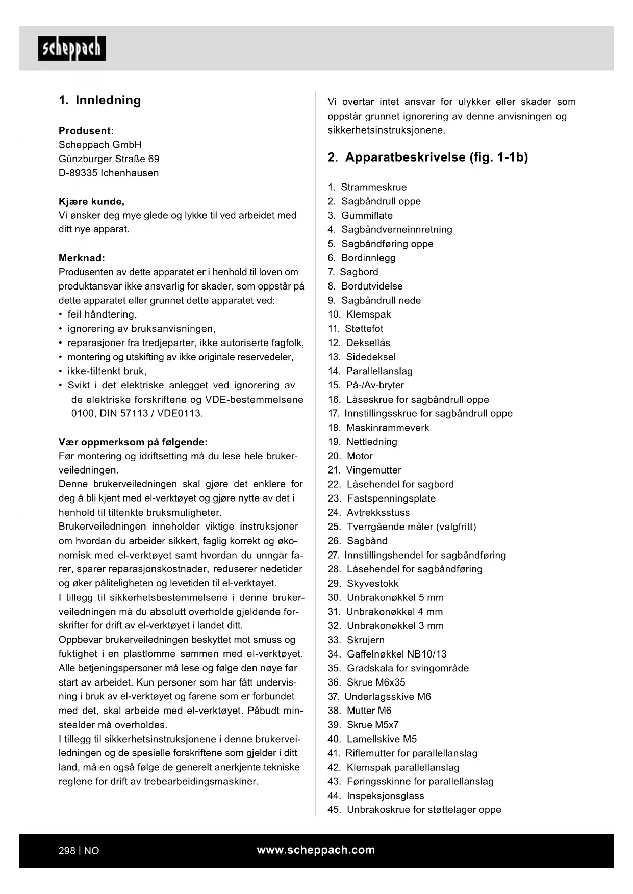 Produsent: Scheppach GmbH Günzburger Straße 69 D-89335 Ichenhausen Kjære kunde, Vi ønsker deg mye glede og lykke til ved arbeidet med ditt nye apparat. Merknad: Produsenten av dette apparatet er i henhold til loven om produktansvar ikke ansvarlig for skader, som oppstår på dette apparatet eller grunnet dette apparatet ved: