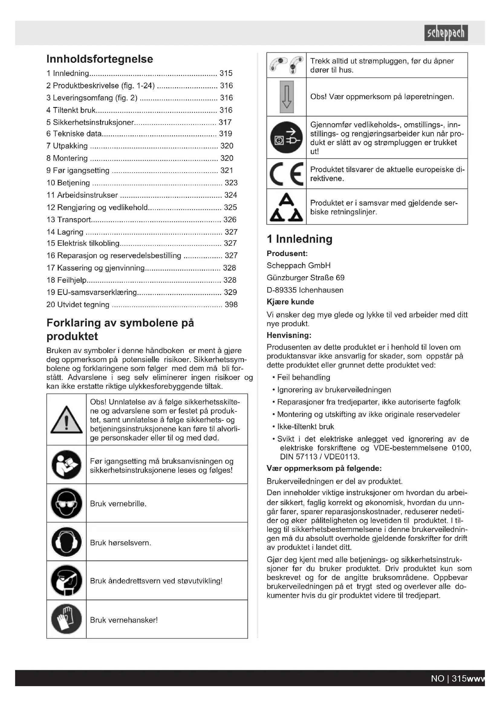 - Dokumentationsansvarlig: Georg Kohler Günzburger Str. 69 D-89335 Ichenhausen Ichenhausen, 09.10.2024 Simon Schunk Division Manager Product Center Andreas Pecher Head of Project Management 314 | DK www.scheppach.comInnholdsfortegnelse 1 Innledning p. 315