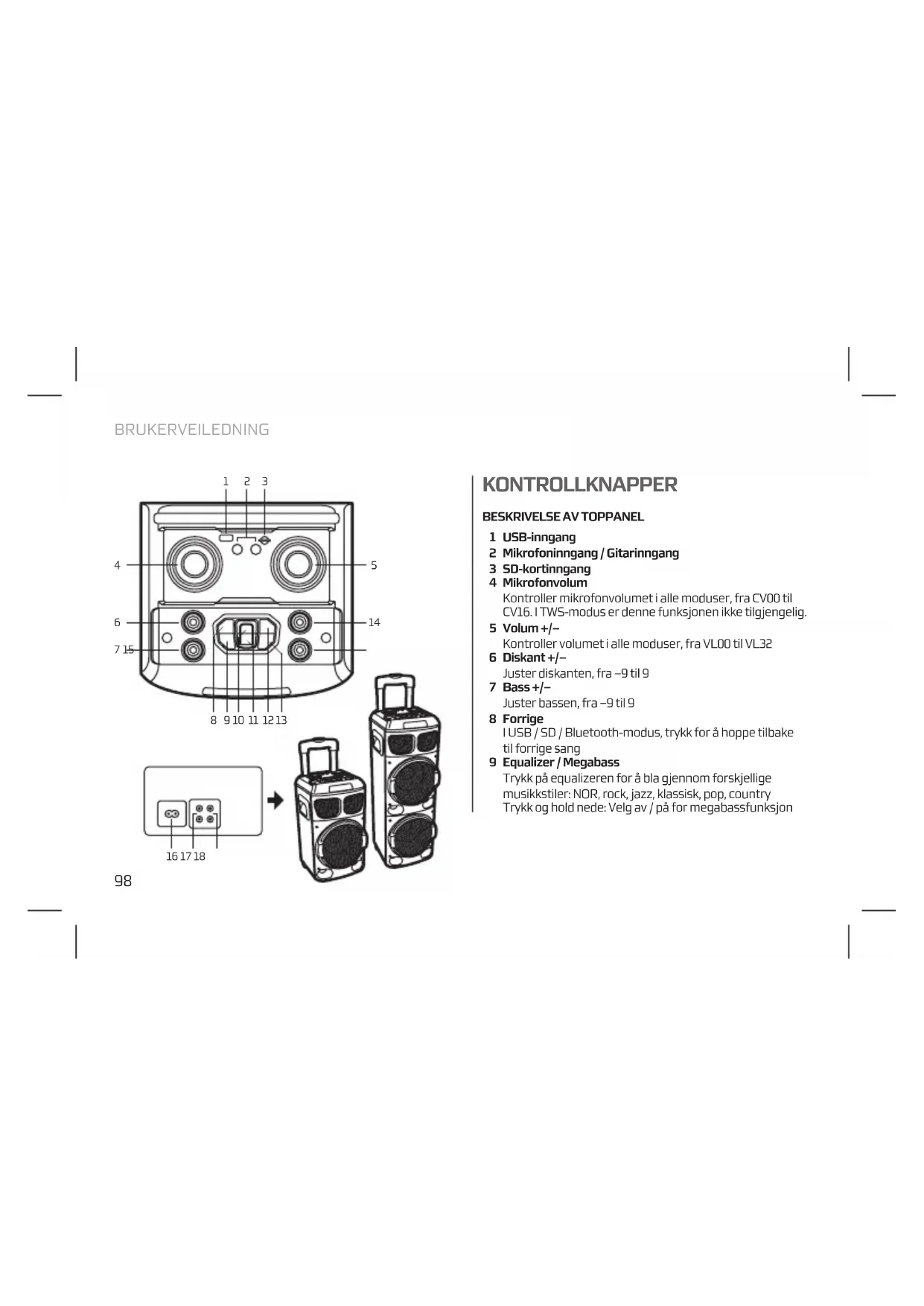 USB-inngang Mikrofoninngang / Gitarinngang SD-kortinngang Mikrofonvolum Kontroller mikrofonvolumet i alle moduser, fra CV00 til CV16. I TWS-modus er denne funksjonen ikke tilgjengelig. Volum +/– Kontroller volumet i alle moduser, fra VL00 til VL32 Diskant +/– Juster diskanten, fra –9 til 9 Bass +/– Juster bassen, fra –9 til 9 Forrige I USB / SD / Bluetooth-modus, trykk for å hoppe tilbake til forrige sang Equalizer / Megabass Trykk på equalizeren for å bla gjennom forskjellige musikkstiler: NOR, rock, jazz, klassisk, pop, country Trykk og hold nede: Velg av / på for megabassfunksjon