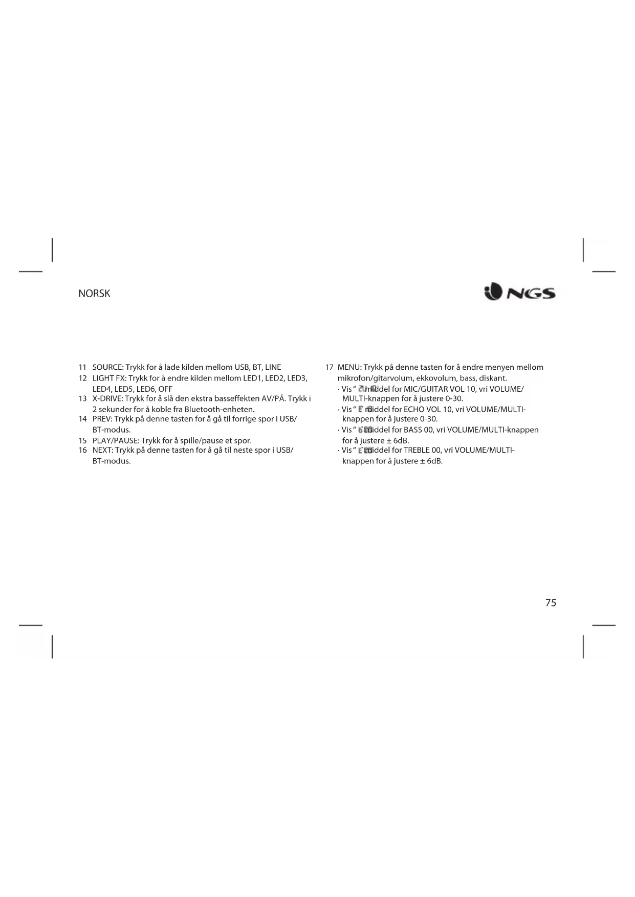 NORSK USBKORT / BLUETOOTH A. Slå på 2 høyttalere og velg begge INPUT-modus som Bluetooth. B. Trykk “ ” -tasten på høyttalersettet i 2 sekunder og “ ” vises. Når visningslampen er “ ” eller det høres en tone fra en annen enhet, etableres TWS. C. Slå på Bluetooth-funksjonen på mobiltelefonen din for å søke etter Bluetooth-enheter, velg “NGS WILDRAVE” fra søkeresultatet. Velg OK og JA for å sammenkoble denne enheten med mobiltelefonen din og konstant blått lys indikerer en vellykket tilkobling. Når du er tilkoblet kan du spille musikk fra mobiltelefonen din. D. Trykk “ ” -tasten på høyttalerenheten i 2 sekunder. Slå av TWS-funksjonene når “ ” vises. USB-KORT SPILLING Når USB-kortet er satt på kan det spille MP3 / AMR / WAV / WMA / FLAC-formatmusikken fra USB-en. Trykk på PREV/NEXT- knappene for å velge sangen du ønsker. Trykk på play/pause- knappen for å pause / fortsette musikken. BLUETOOTHMODUS A. Trykk på SOURCE-knappen til skjermen viser ordet BL. I Bluetooth-modus går enheten til søke / sammenkoble / tilkoblingsmodus for sammenkobling. B. Nå, slå ON på Bluetooth-funksjonen på mobiltelefonen din. C. Søk etter “NGS WILDRAVE” og velg den for å sammenkoble (for første gang sammenkobling eller sammenkobling av en ny mobilenhet). D. Bluetooth-høyttaleren kobles automatisk på nytt hvis mobiltelefonen din er sammenkoblet (avhengig av mobiltelefonens type og kongurasjon kan det kreves manuell tilkobling på noen enheter). E. For å koble høyttaleren fra mobiltelefonen, trykk og hold inne X DRIVE-knappen i 2 sekunder. TWSMODUS