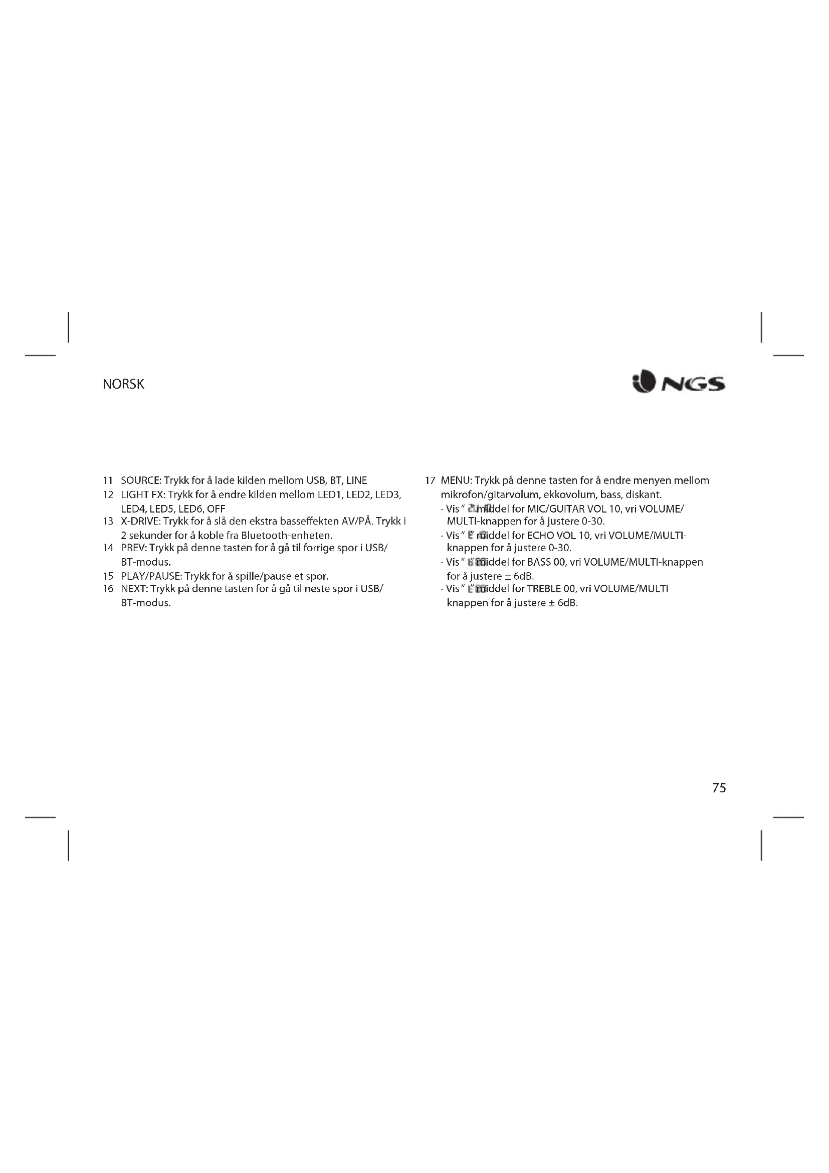 X-DRIVE: Trykk for å slå den ekstra basseekten AV/PÅ. Trykk i 2 sekunder for å koble fra Bluetooth-enheten. PREV: Trykk på denne tasten for å gå til forrige spor i USB/ BT-modus. PLAY/PAUSE: Trykk for å spille/pause et spor. NEXT: Trykk på denne tasten for å gå til neste spor i USB/ BT-modus. MENU: Trykk på denne tasten for å endre menyen mellom mikrofon/gitarvolum, ekkovolum, bass, diskant.