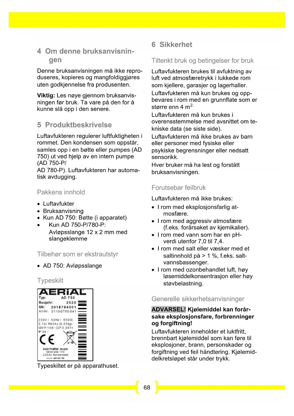 - AD 750: Avløpsslange Typeskilt Typeskiltet er på apparathuset. 6 Sikkerhet Tiltenkt bruk og betingelser for bruk Luftavfukteren brukes til avfuktning av luft ved atmosfæretrykk i lukkede rom som kjellere, garasjer og lagerhaller. Luftavfukteren må kun brukes og opp- bevares i rom med en grunnflate som er større enn 4 m