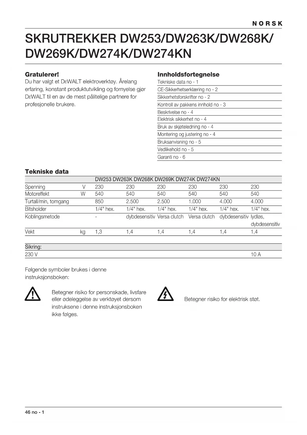 Director Engineering and Product Development Horst Großmann DEWALT, Richard-Klinger-Straße 40, D-65510, Idstein, Tyskland Sikkerhetsforskrifter Ta deg tid til å lese nøye gjennom bruksanvisningen før du begynner å bruke maskinen. Oppbevar bruksanvisningen på et lett tilgjengelig sted slik at alle som skal bruke maskinen lett kan finne den. I tillegg til nedenforstående forskrifter, må alle vernebestemmelsene til Statens Arbeidstilsyn følges når det gjelder arbeid med elektroverktøy. ADVARSEL! Ved bruk av elektroverktøy må disse grunnleggende sikkerhetsforskrifter følges for å redusere risikoen for elektrisk støt, personskade og brann. 1 Bruk hørselsvern Støynivået ved bearbeiding av forskjellige materialer kan variere, og i blant kan nivået overstige 85 dB(A). For å beskytte deg selv bør du alltid bruke hørselsvern. 2 Hold arbeidsområdet rent og ryddig En uryddig arbeidsplass innbyr til skader. 3 Tenk på arbeidsmiljøet Utsett ikke elektroverktøy for regn. Ikke bruk det på fuktige eller våte steder. Sørg for god belysning over arbeidsplassen. Bruk ikke elektroverktøy i nærheten av brannfarlige væsker eller gasser. 4 Beskytt deg mot elektrisk støt Unngå kroppskontakt med jordede deler (for eksempel vannrør, komfyrer, kjøleskap o.l.). Under ekstreme arbeidsforhold (for eksempel ved høy luftfuktighet, forekomst av metallstøv o.l.) kan man øke sikkerheten ved å tilkoble en jordfeilbryter. 5 Hold barn unna Ikke la barn komme i kontakt med verktøyet eller skjøteledningen. Det skal holdes tilsyn med barn under 16 år. 6 Oppbevar elektroverktøy på et trygt sted Når maskinen ikke er i bruk, skal den oppbevares på et tørt sted, gjerne høyt oppe og innlåst, utenfor barns rekkevidde. 7 Overbelast ikke maskinen Maskinen arbeider bedre og sikrere innenfor det angitte effektområdet. 8 Bruk riktig elektroverktøy Tving ikke en maskin til å gjøre arbeid som krever kraftigere verktøy.NORSK 48 no - 3 Bruk ikkeelektroverktøy til formål det ikke er ment for, som for eksempel å fjerne kvister eller kappe ved med en håndsirkelsag. 9 Kle deg riktig Ha ikke på deg løstsittende klær eller smykker. De kan sette seg fast i de bevegelige delene. Vi anbefaler gummihansker og sko som ikke glir når du arbeider utendørs. Bruk hårnett hvis du har langt hår. 10 Bruk vernebriller Bruk vernebriller for å unngå at det blåser støv inn i øynene og skader deg. Hvis det støver mye, bør du bruke ansikts- eller støvmaske. 11 Stell pent med ledningen Bær ikke maskinen i ledningen og, trekk ikke i ledningen når du skal ta støpselet ut av stikkontakten. Utsett ikke ledningen for varme, olje eller skarpe kanter. 12 Sikre arbeidsstykket Bruk tvinger eller skrustikker til å feste arbeidsstykket med. Dette er sikrere enn å bruke hånden, og du får begge hendene fri til å arbeide med. 13 Strekk deg ikke for langt Pass på at du alltid har sikkert fotfeste og balanse. 14 Vær nøye med vedlikeholdet Hold tilbehøret skarpt og rent. Følg forskriftene når det gjelder vedlikehold og skifte av tilbehør. Kontroller maskinens ledning regelmessig og få den reparert av et autorisert verksted om den skulle bli skadet. Kontroller skjøteledninger regelmessig, skift dem ut om de skulle bli skadet. Hold håndtakene tørre, rene og fri for olje og fett. 15 Trekk støpselet ut av stikkontakten Trekk alltid støpselet ut av stikkontakten når maskinen ikke er i bruk, ved vedlikehold og ved skifte av tilbehør. 16 Fjern nøkler Gjør det til vane å sjekke om nøkler og justeringsverktøy er fjernet før maskinen startes. 17 Unngå at verktøyet blir slått på utilsiktet Bær ikke maskinen med fingeren på strømbryteren når den er tilkoblet strømnettet. Pass på at strømbryteren er avslått når du setter støpselet i stikkontakten. 18 Utendørs skjøteledning Utendørs må det bare brukes skjøteledning som er tillatt for utendørs bruk og merket for dette. 19 Vær oppmerksom Se på det du gjør. Bruk sunn fornuft. Bruk ikke maskinen når du er trett. 20 Sjekk skadede deler før du setter støpselet i stikkontakten Før fortsatt bruk av maskinen skal eventuelle skadede deler eller deksler kontrolleres nøye for å bringe på det rene om de fungerer riktig og utfører det de skal. Kontroller justeringen av bevegelige deler, om de sitter i klemme, om deler er brukket. Sjekk at alt er riktig montert og er slik det skal være. En del eller et deksel som er skadet, skal repareres eller skiftes ut av et autorisert verksted dersom ikke annet er angitt i bruksanvisningen. Ødelagte brytere skal repareres av et autorisert serviceverksted. Bruk ikke maskinen hvis den ikke kan slås av og på med bryteren. 21 ADVARSEL! Bruk bare tilbehør og utstyr som anbefales i bruksanvisningen og i katalogene. Bruk av annet verktøy eller tilbehør enn det som anbefales i bruksanvisningen eller i katalogene kan medføre en mulig risiko for personskade. 22 La verktøyet repareres av et autorisert DEWALT serviceverksted Dette elektroverktøyet er i samsvar med gjeldende sikkerhetsforskrifter. Unngå risiko: Overlat alltid reparasjon av elektriske apparater til kvalifisert servicepersonale. Kontroll av pakkens innhold Pakken inneholder: 1 Skrutrekker DW263K eller 1 Universalskrutrekker DW253/DW268K/DW269K eller 1 Gipsskrutrekker DW274K/DW274KN 1 Koffert (kun K-modeller) 1 Instruksjonsbok 1 Splitt-tegning