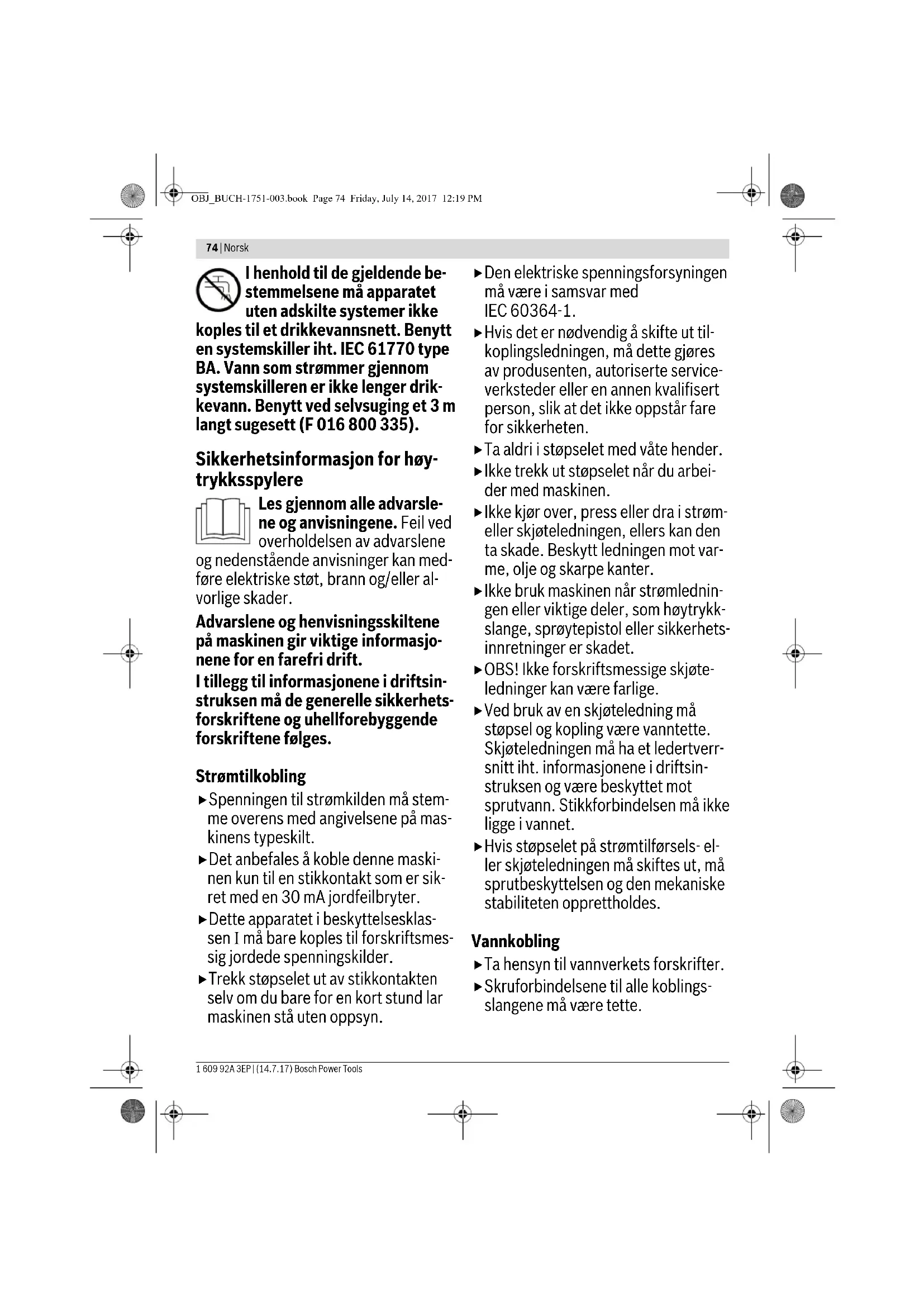 Høytrykkspyler GHP 5-13 C Informasjonene gjelder for nominell spenning [U] på 230 V. Ved avvi-kende spenning og på visse nasjonale modeller kan disse informasjone-ne variere noe.Innkoblinger fører til korte spenningsreduksjoner. Ved ugunstige nett-vilkår kan det oppstå forstyrrelser på andre apparater. Ved nettimpe-danser på mindre enn 0,358 Ohm forventes det ingen forstyrrelser. OBJ_BUCH-1751-003.book Page 77 Friday, July 14, 2017 12:19 PM Ω 0,35878 | Norsk 1 609 92A 3EP | (14.7.17) Bosch Power Tools Hvis det er nødvendig å skifte ut tilkoplingsledningen, må det- te gjøres av Bosch eller Bosch-serviceverksteder, slik at det ikke oppstår fare for sikkerheten. Bruk bare godkjente skjøtekabler. OBS! Ikke forskriftsmessige skjøteledninger kan være farlige. Skjøteledninger, støpsler og koblinger må være vanntette modeller som er godkjent for utendørs bruk. Bruk bare skjøtekabler, skjøteledninger eller kabeltromler som er i samsvar med standardene EN 61242 / IEC 61242 el- ler IEC 60884-2-7. Hvis du vil bruke en skjøtekabel for drift av redskapet, er det nødvendig med følgende ledertverrsnitt: – Ledertverrsnitt 1,5 mm