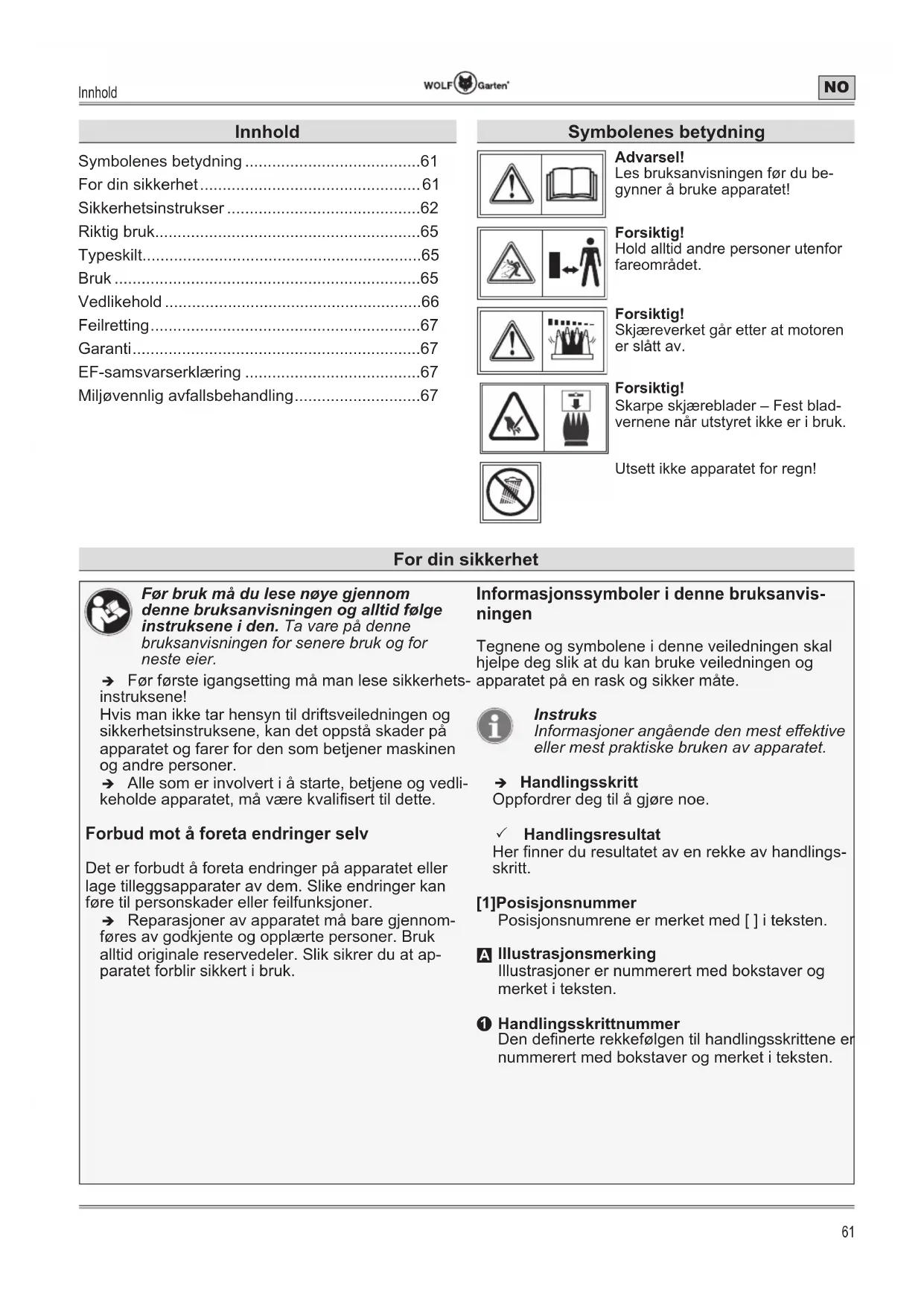 Sikkerhetsinstrukser Farenivåer for advarslene I denne bruksanvisningen benyttes følgende fareni- våer for å beskrive mulige faresituasjoner: FARE ! Den farlige situasjonen er nært forestående, og kan medføre lette personskader og helt til død hvis tiltakene ikke følges. ADVARSEL ! En farlig situasjon kan inntree, og kan medføre alvorlige personskader og død hvis tiltakene ikke blir fulgt. FORSIKTIG ! Den farlig situasjonen kan inntree, og kan medføre lette personskader hvis tiltakene ikke følges. OBS ! Det kan oppstå en potensielt skadelig situasjon som, hvis den ikke unngås, kan føre til materielle skader. Oppbygging av sikkerhetsinstrukser FARE ! Faretype og -kilde! ÂFølger ved neglisjering ¾ Tiltak for å avverge fare Arbeidsplassikkerhet ¾ Hold alltid arbeidsområdet rent og godt opplyst. Uorden eller ubelyst arbeidsområde kan føre til ulykker. ¾ Ikke arbeid med elektroverktøyet i eksplosjonsfarlige omgivelser, hvor det benner seg brennbare væsker, gass eller støv.Elektroverktøy kan avgi gnister som kan antennes i støv eller damp. ¾ Hold barn og andre personer på avstand under bruk av elektroverktøyet.Ved utslag kan du miste kontrollen over apparatet. Elektrisk sikkerhet ¾ Trekk nettstøpslet ut med en gang ledningen skades eller kuttes over. ¾ Tilkoblingsstøpslet til elektroverktøyet må passe til kontakten. Støpslet må ikke endres på noen måte. Bruk ikke adapterstøpsel sammen med jordete elektroverktøy. Uforandrede støpsler og kontakter reduserer faren for et strømstøt. ¾ Unngå kroppskontakt med jordete overater som rør, varmeapparater, ovner og kjøleskap. Risikoen for strømstøt økes hvis kroppen din er jordet. ¾ Hold elektroverktøy borte fra regn eller fuktighet. Hvis det trenger vann inn i elektroverktøyet, øker risikoen for elektrisk støt. ¾ Bruk ikke kabelen til å holde elektroverktøyet, henge det opp eller for å trekke støpslet ut av kontakten. Hold kabelen på avstand fra varme, olje, skarpe kanter eller bevegelige apparatdeler. Skadde eller forviklede kabler øker risikoen for elektrisk støt. ¾ Bruk bare laderen til å lade Wolf Garten- batterier. Batterispenningen må stemme overens med ladespenningen til laderen. Ellers er det brann- og eksplosjonsfare. ¾ Hold apparatet rent. Hvis apparatet blir skittent, er det fare for elektrisk støt. Sikkerheten til personer ¾ Dette apparatet må ikke brukes av personer med begrensede fysiske, sansemessige eller psykiske evner eller manglende erfaring og kunnskap – heller ikke hvis de bruker apparatet under tilsyn eller har fått opplæring i sikker bruk av apparatet og dermed forstår hvilke farer som er forbundet med å bruke det. ¾ Barn må ikke leke med dette apparatet. ¾ Rengjøring og daglig vedlikehold må ikke overlates til barn. ¾ Ikke bruk apparatet hvis sikkerhetsinnretningene er skadde eller ikke montert. ¾ Vær oppmerksom på det du gjør, og bruk sunn fornuft når du utfører arbeidene med elektroverktøyet. Bruk ikke elektroverktøyet når du er trett, eller under påvirkning av sto, alkohol eller legemidler. Et øyeblikks uoppmerksomhet ved bruk av elektroverktøyet kan føre til alvorlige personskader.Sikkerhetsinstrukser