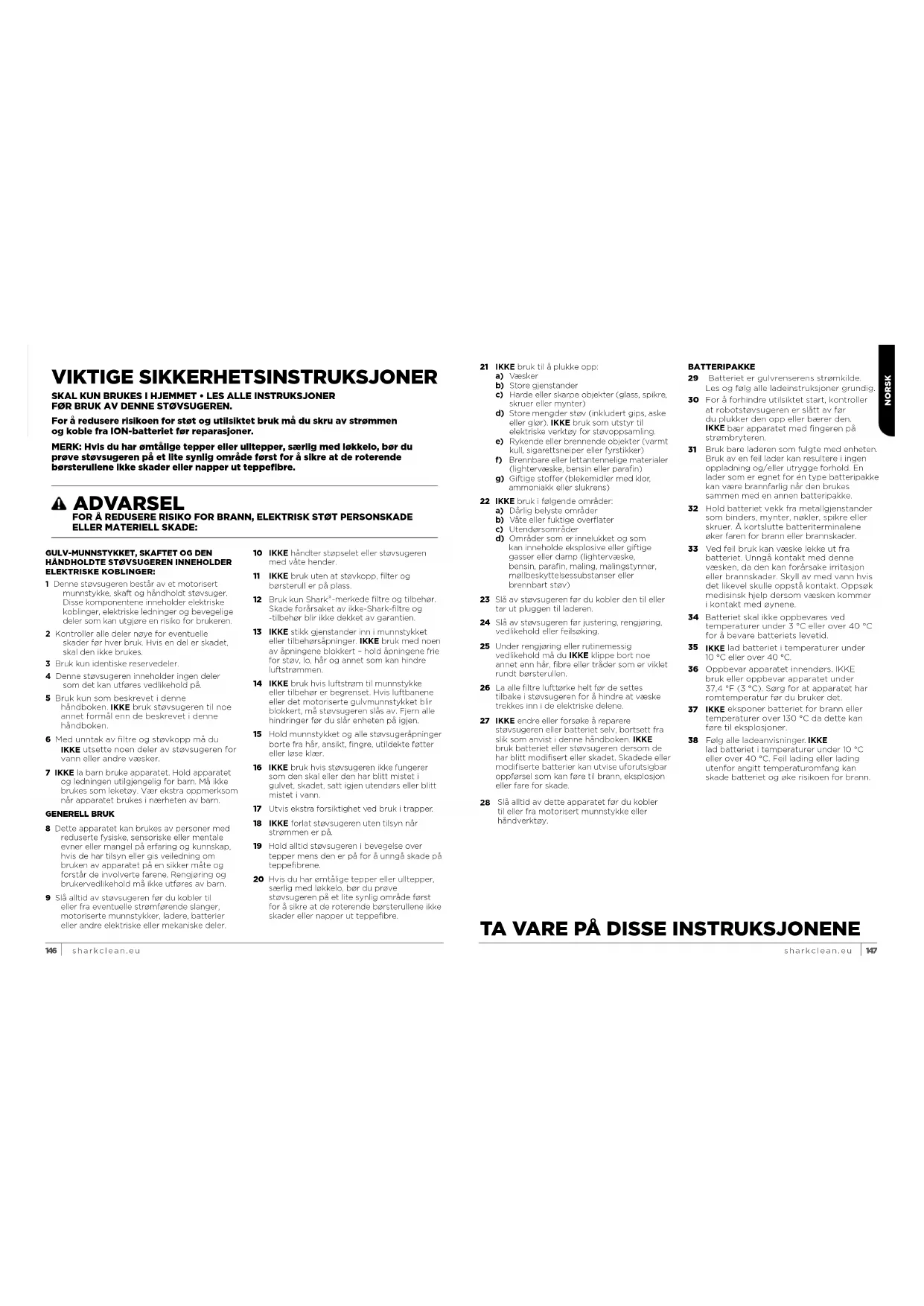 sharkclean.euNORSK BATTERIPAKKE 29 Batteriet er gulvrenserens strømkilde. Les og følg alle ladeinstruksjoner grundig. 30 For å forhindre utilsiktet start, kontroller at robotstøvsugeren er slått av før du plukker den opp eller bærer den. IKKE bær apparatet med fingeren på strømbryteren.