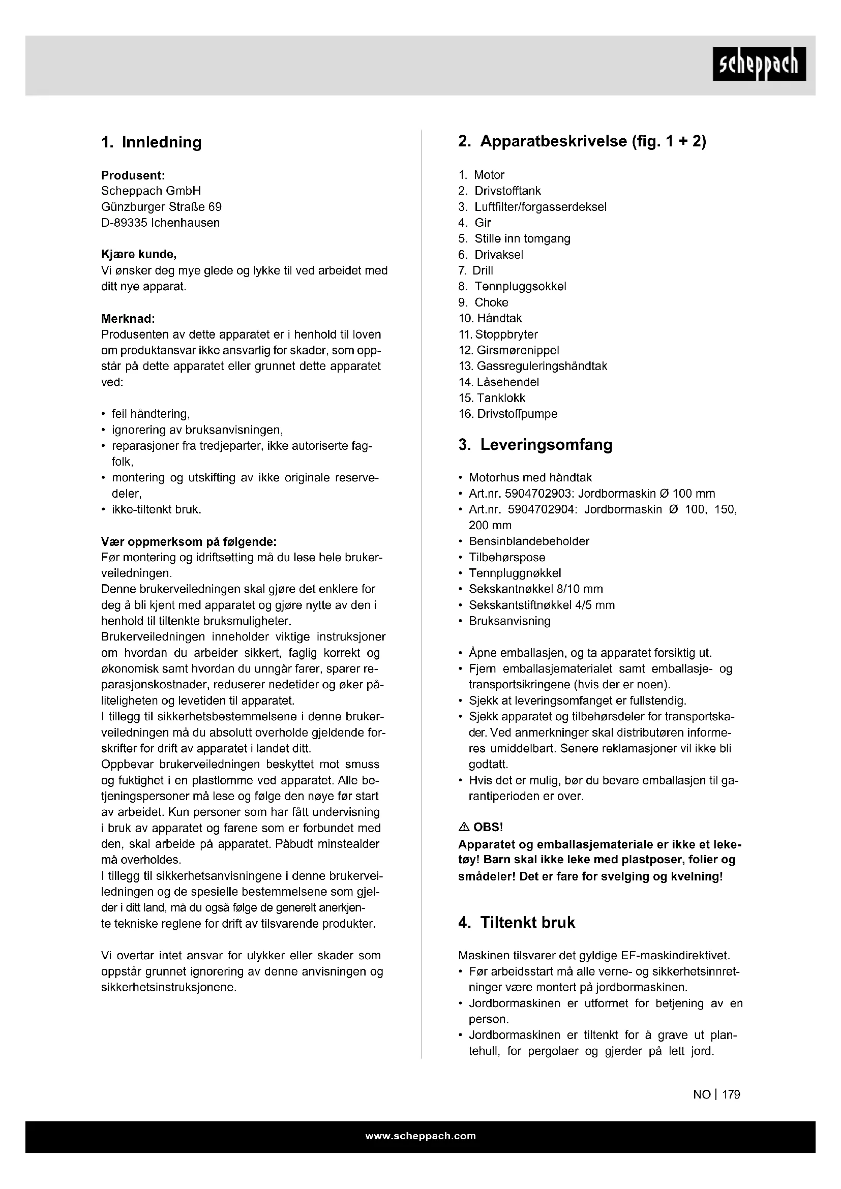 - ikke-tiltenkt bruk. Vær oppmerksom på følgende: Før montering og idriftsetting må du lese hele bruker- veiledningen. Denne brukerveiledningen skal gjøre det enklere for deg å bli kjent med apparatet og gjøre nytte av den i henhold til tiltenkte bruksmuligheter. Brukerveiledningen inneholder viktige instruksjoner om hvordan du arbeider sikkert, faglig korrekt og økonomisk samt hvordan du unngår farer, sparer re- parasjonskostnader, reduserer nedetider og øker på- liteligheten og levetiden til apparatet. I tillegg til sikkerhetsbestemmelsene i denne bruker- veiledningen må du absolutt overholde gjeldende for- skrifter for drift av apparatet i landet ditt. Oppbevar brukerveiledningen beskyttet mot smuss og fuktighet i en plastlomme ved apparatet. Alle be- tjeningspersoner må lese og følge den nøye før start av arbeidet. Kun personer som har fått undervisning i bruk av apparatet og farene som er forbundet med den, skal arbeide på apparatet. Påbudt minstealder må overholdes. I tillegg til sikkerhetsanvisningene i denne brukervei- ledningen og de spesielle bestemmelsene som gjel- der i ditt land, må du også følge de generelt anerkjen- te tekniske reglene for drift av tilsvarende produkter. Vi overtar intet ansvar for ulykker eller skader som oppstår grunnet ignorering av denne anvisningen og sikkerhetsinstruksjonene.www.scheppach.com