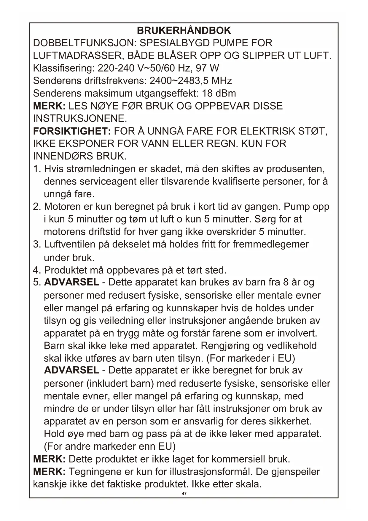 personer med redusert fysiske, sensoriske eller mentale evner eller mangel på erfaring og kunnskaper hvis de holdes under tilsyn og gis veiledning eller instruksjoner angående bruken av apparatet på en trygg måte og forstår farene som er involvert. Barn skal ikke leke med apparatet. Rengjøring og vedlikehold skal ikke utføres av barn uten tilsyn. (For markeder i EU) ADVARSEL - Dette apparatet er ikke beregnet for bruk av personer (inkludert barn) med reduserte fysiske, sensoriske eller mentale evner, eller mangel på erfaring og kunnskap, med mindre de er under tilsyn eller har fått instruksjoner om bruk av apparatet av en person som er ansvarlig for deres sikkerhet. Hold øye med barn og pass på at de ikke leker med apparatet. (For andre markeder enn EU) MERK: Dette produktet er ikke laget for kommersiell bruk. MERK: Tegningene er kun for illustrasjonsformål. De gjenspeiler kanskje ikke det faktiske produktet. Ikke etter skala.48 Pumpens driftsinstruksjoner: Merk: Inflasjon og deflasjon stoppes automatisk i løpet av 5 minutter. Merk: Hold deflasjonsknappen i 2 sekunder for å starte deflasjonen. Merk: Utgangsspenningen og strømmen til USB-ladeporten er DC 5V 1A. Når strømmen er slått på, kan USB-porten lade enheter som en mobiltelefon. Merk: Når pumpen blåser opp eller tapper madrassen, trykker du på " " eller " "-knappen, og pumpen vil slå seg av. Viktig: Pumpen skal ikke betjenes i mer enn 5 minutter om gangen. Etter hver bruk av hovedpumpen, bør pumpen kjøle seg helt ned. RENGJØRING OG OPPBEVARING: